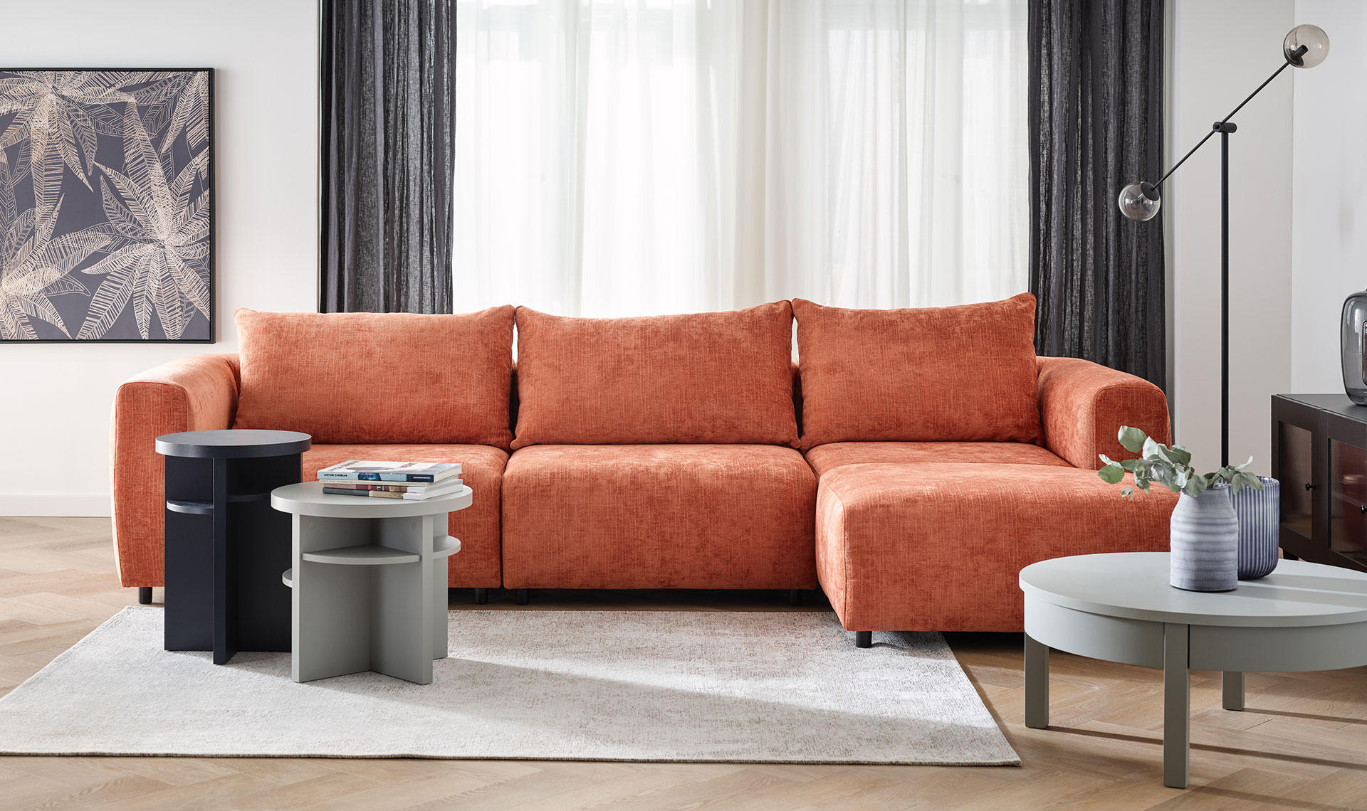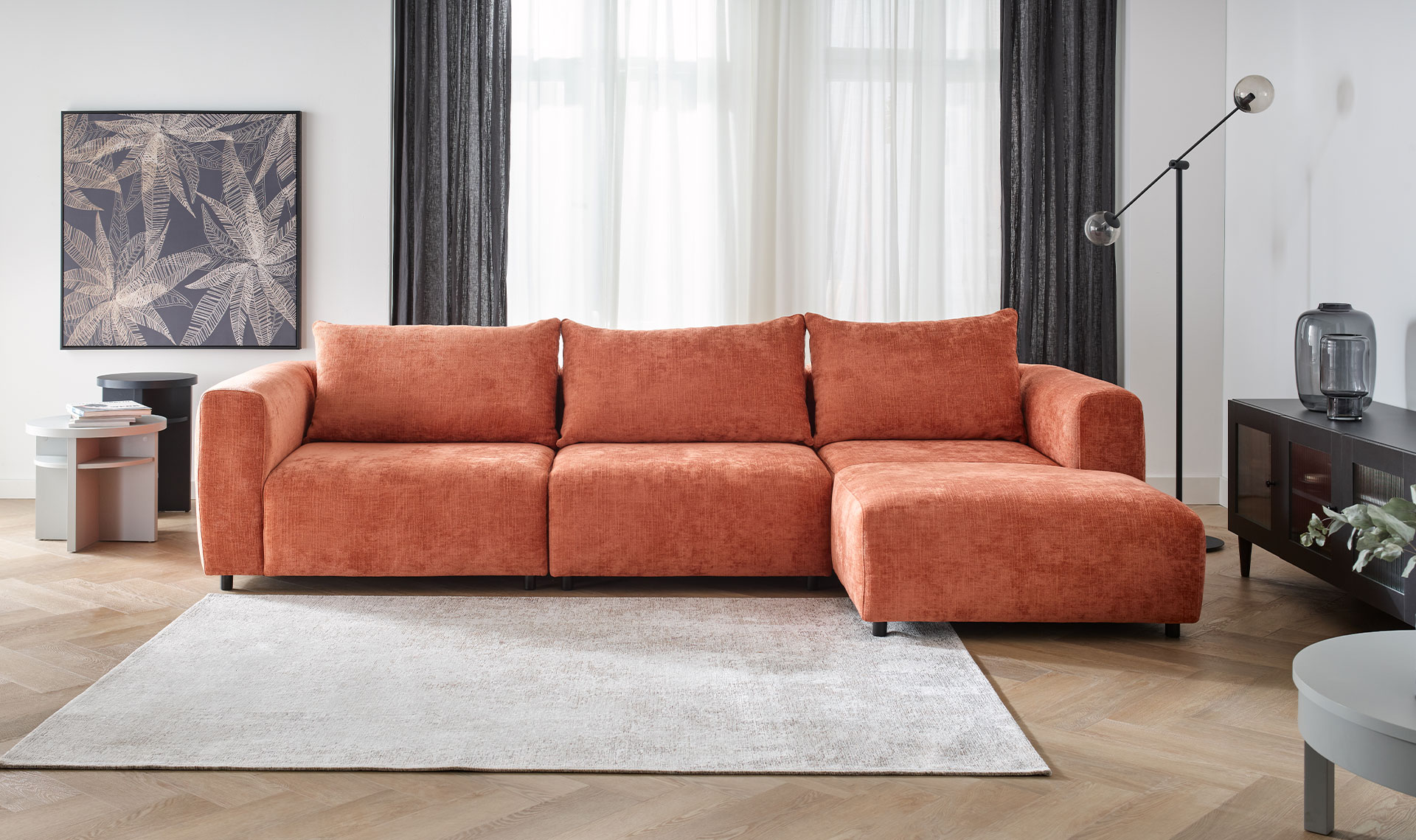 An ultra-comfortable corner sofa for the whole family. Milo charms not only with its rounded shapes, but also with its comfort. The filling of the backrest cushions with goose feathers makes it perfectly adaptable to the body, offering softness and support for the back. It's the perfect piece of furniture for spending time together, watching movies or taking an afternoon nap. Thanks to the fact that it's available in left- and right-handed versions and in a variety of upholstery fabrics, you can easily match it to your style and interior design.