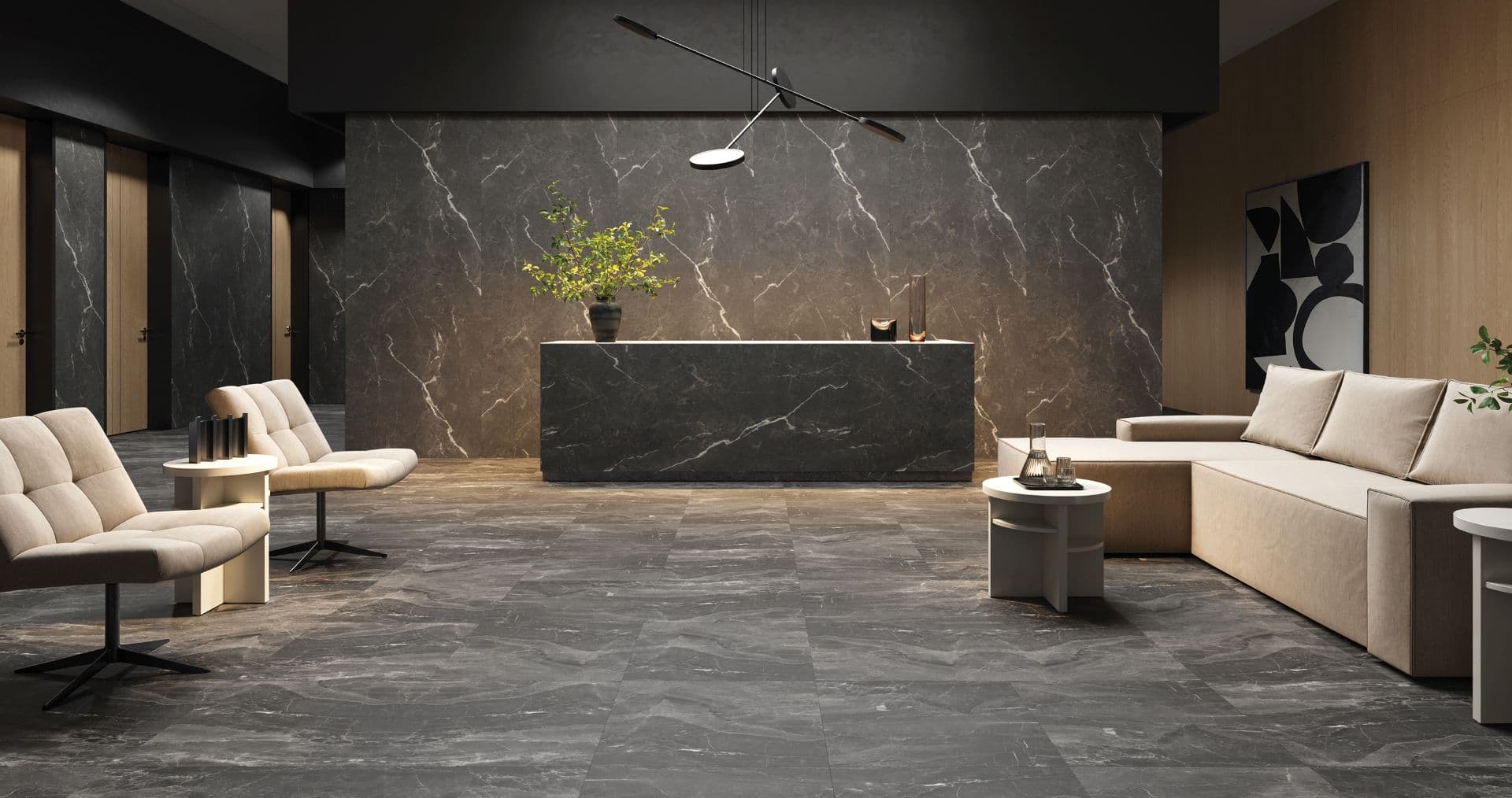 SPC mineral wall panels Idevo Ashen Stone are dark gray, falling into anthracite. They are punctuated by veining in shades of white.