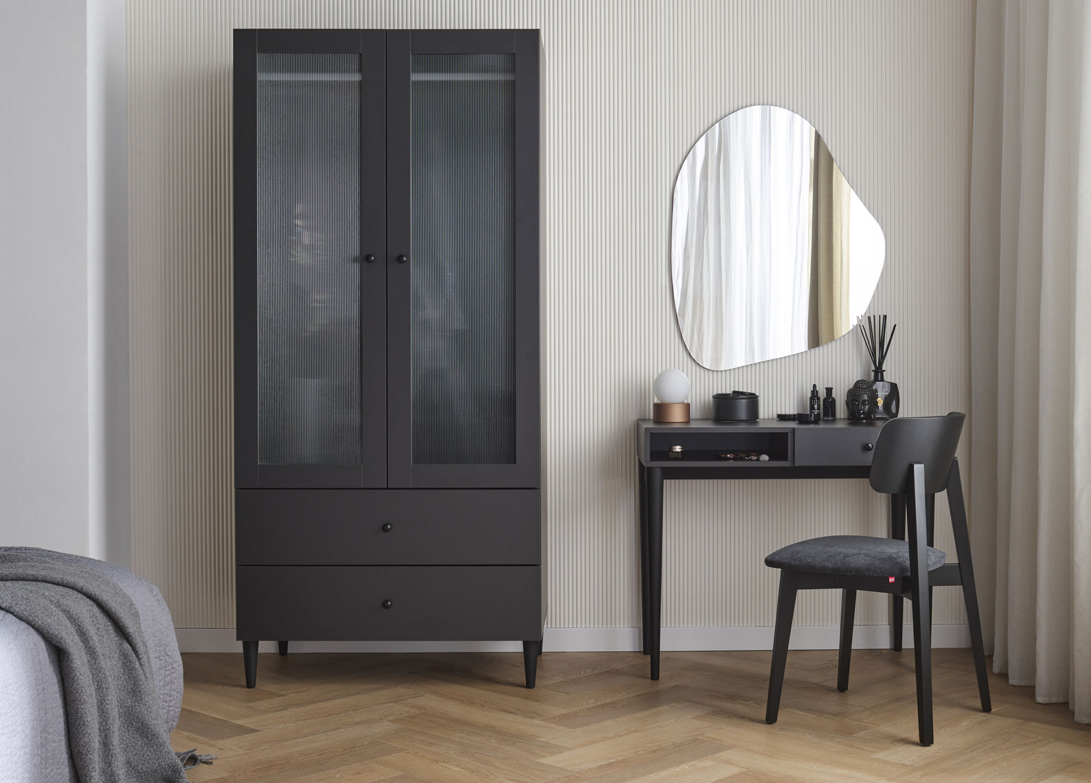 • The frame of the furniture was created from beech wood. The back of the chair is made of beech plywood. Both elements are stained in oak color or painted with opaque black paint.