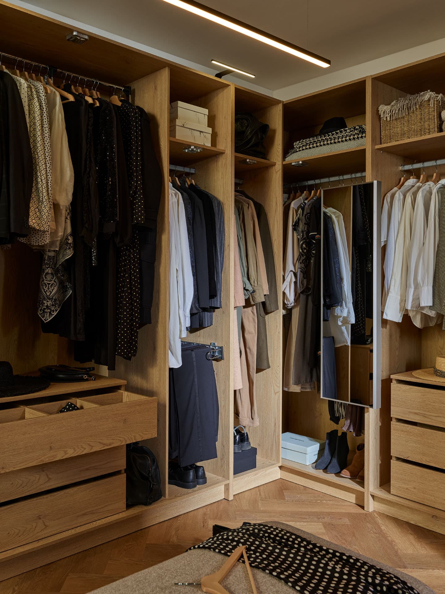 - The interior equipment of the wardrobe can change according to your needs. Just buy an accessory rack to get additional space for organizing clothes and accessories. A container organizer will also come in handy, which will create practical divisions and make it easier to segregate small items.