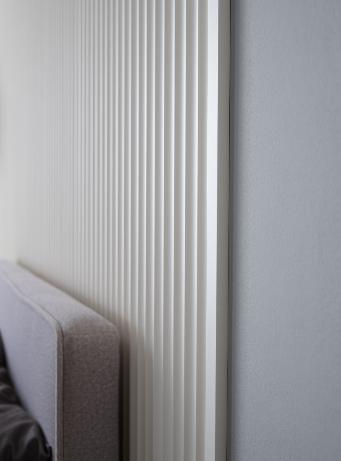 Linerio XS-Line Wave panels bring a modern and dynamic touch to the interior. The original decoration with a concave, wavy pattern of lamellas allows you to highlight a section of the room and improve acoustics. The narrow laths can be placed on the wall or ceiling. They are lightweight, durable and easy to install.