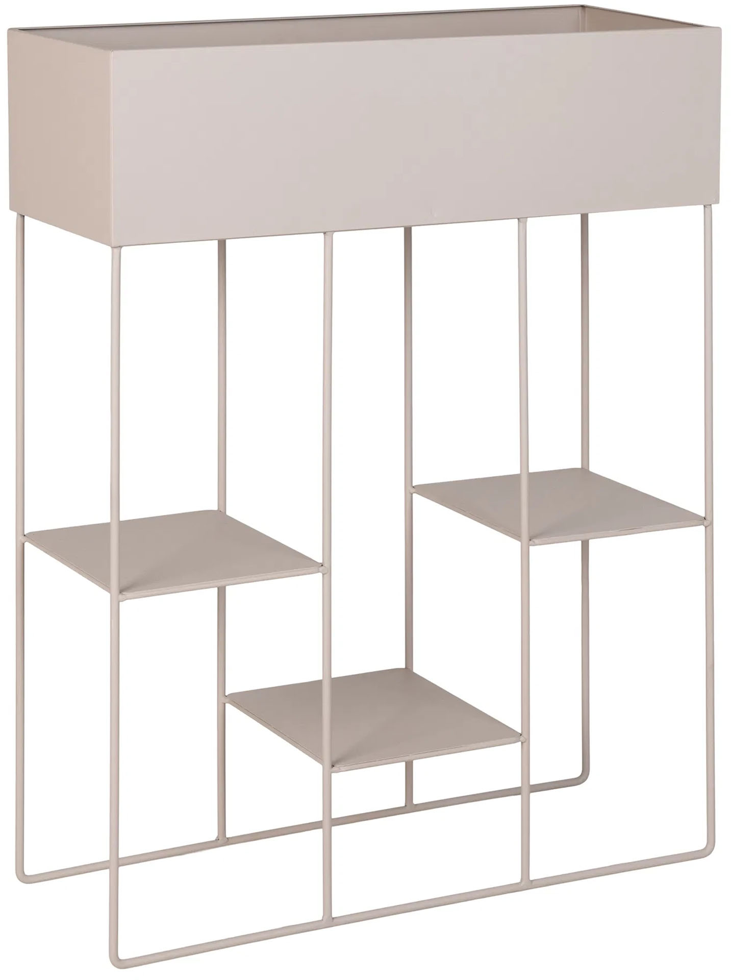 Minimalist flowerbed with a geometric, rectangular design made of metal in a shade of light beige. The upper part is a spacious, oblong pot ideal for displaying larger plants. The structure is equipped with three additional shelves, perfect for arranging smaller potted plants or decorative items. Slender legs provide stability, while adding a light touch to the overall design. The neutral color scheme makes the flowerbed fit perfectly into a variety of interior design styles, from Scandinavian to modern.