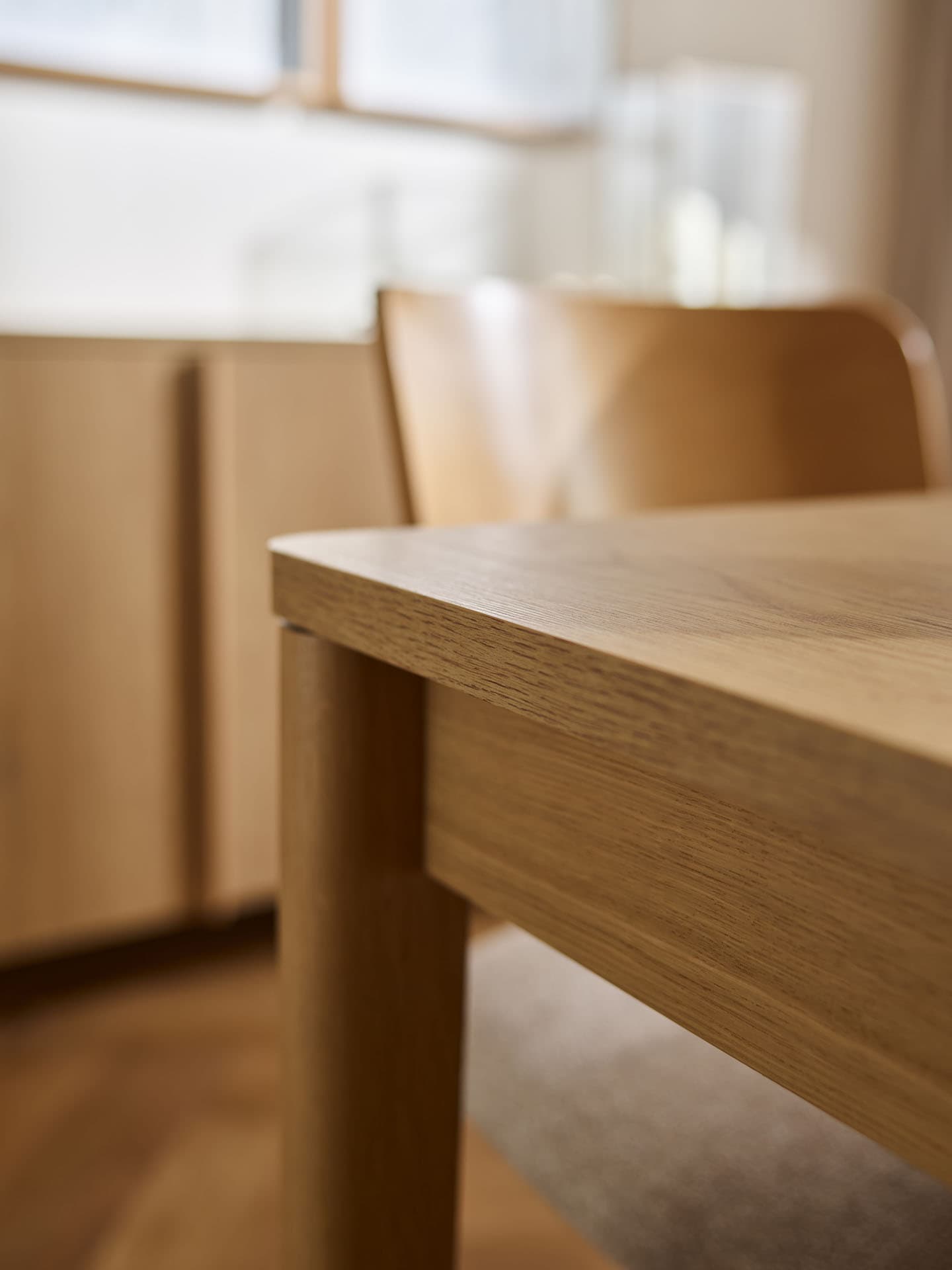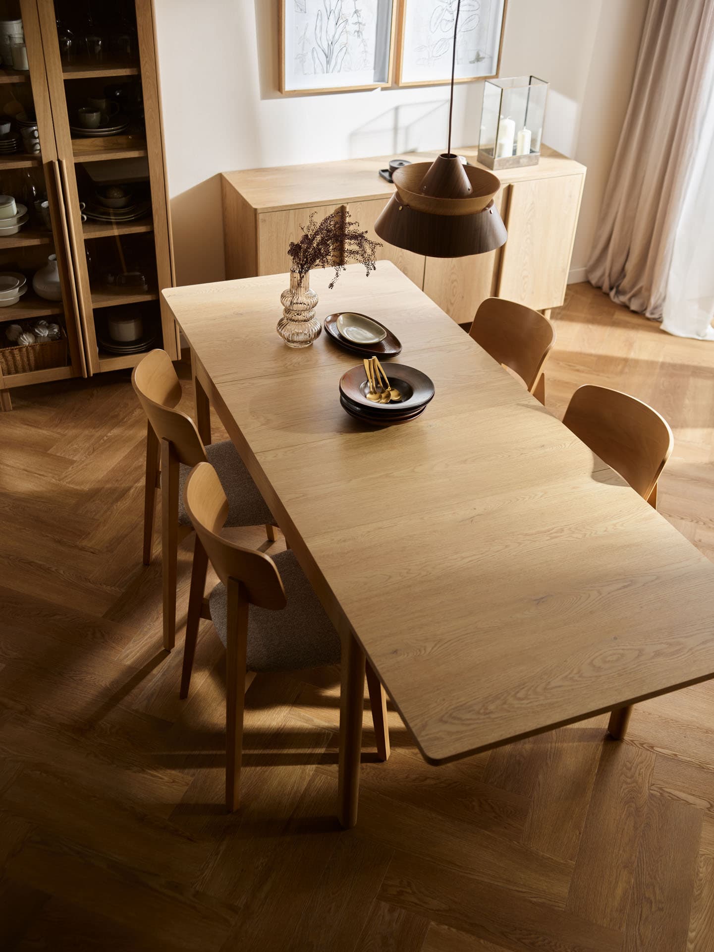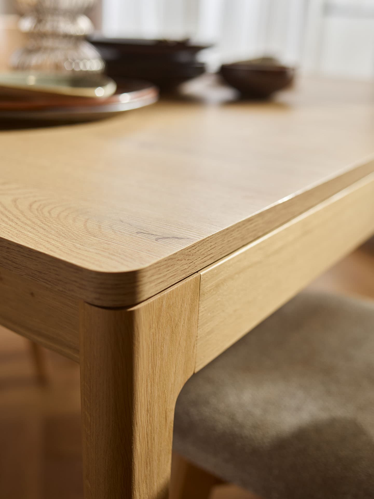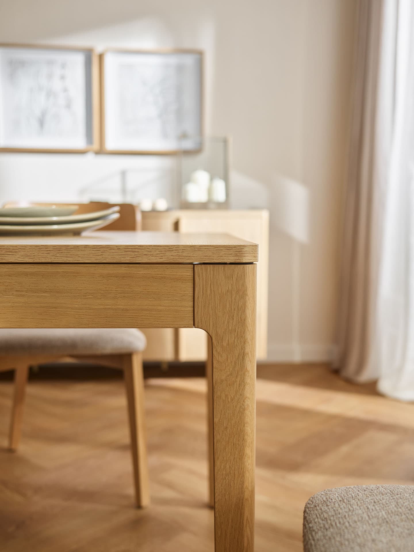 The rectangular extendable table from the Well collection is a functional centerpiece for home gatherings. Thanks to an exceptionally smooth and user-friendly mechanism, it can be extended effortlessly by just one person, quickly expanding to seat up to 10 people. The gently curved tabletop is supported by solid, beautifully finished oak legs and frame, highlighting the natural character of the piece while ensuring lasting durability.