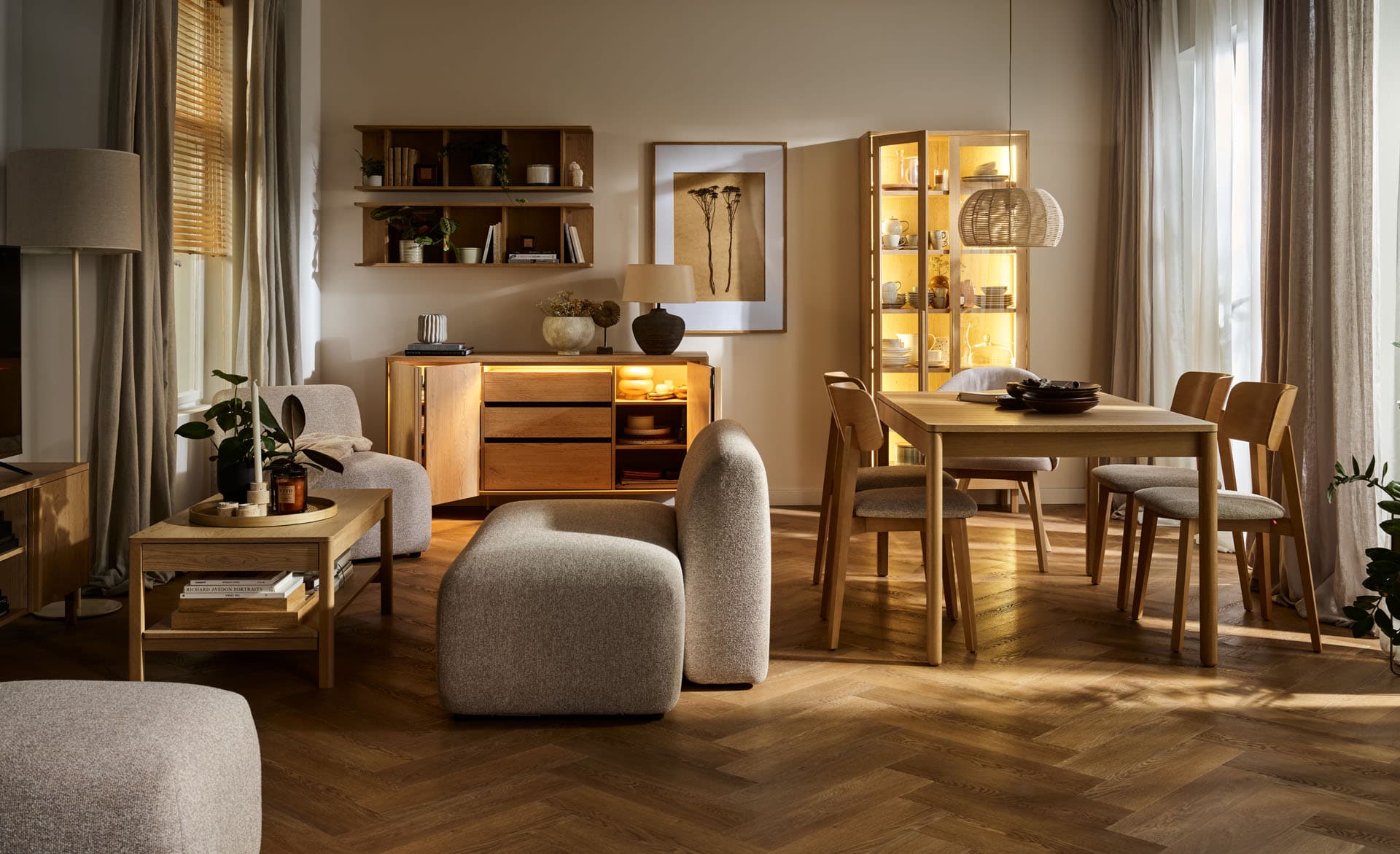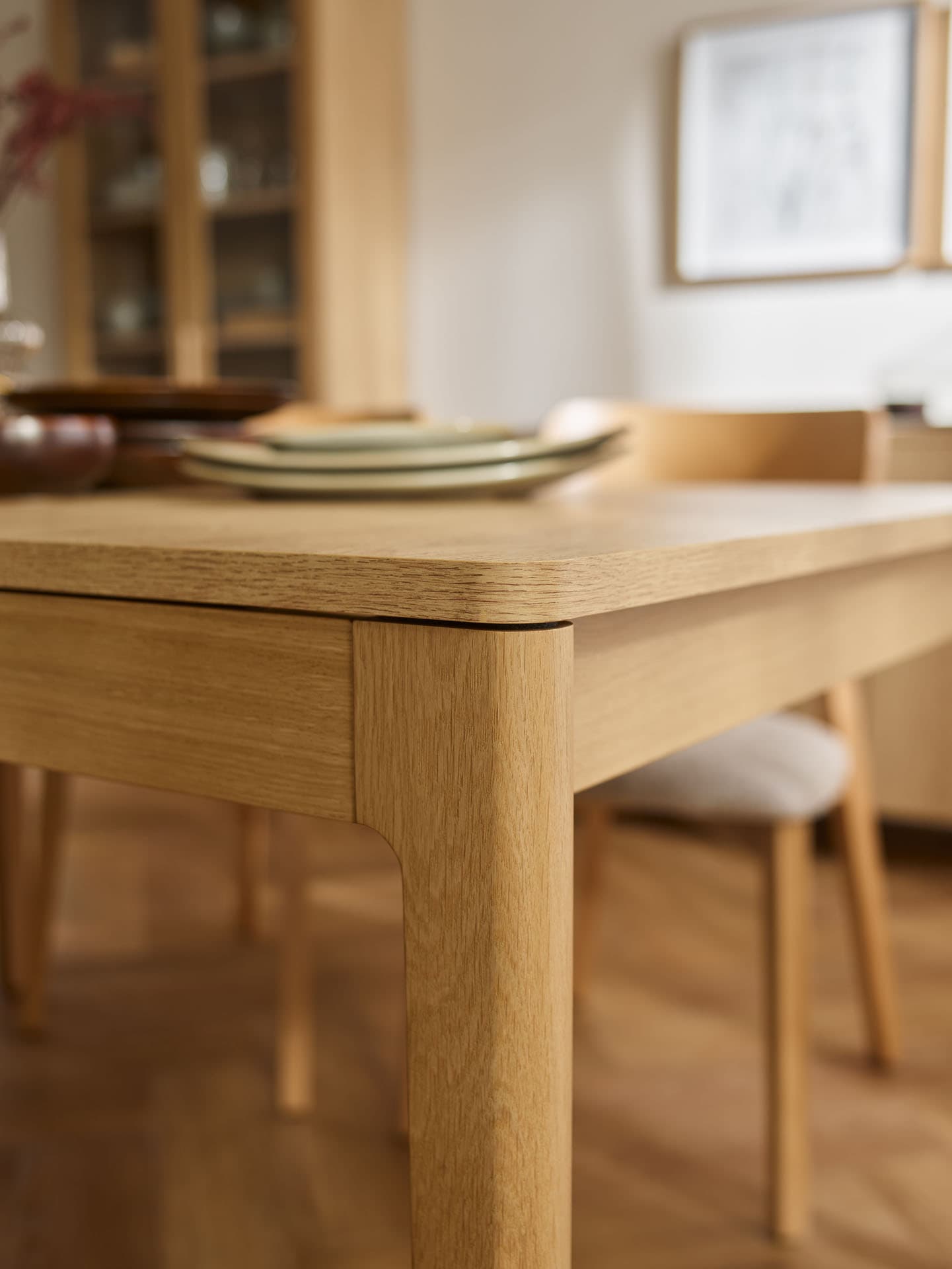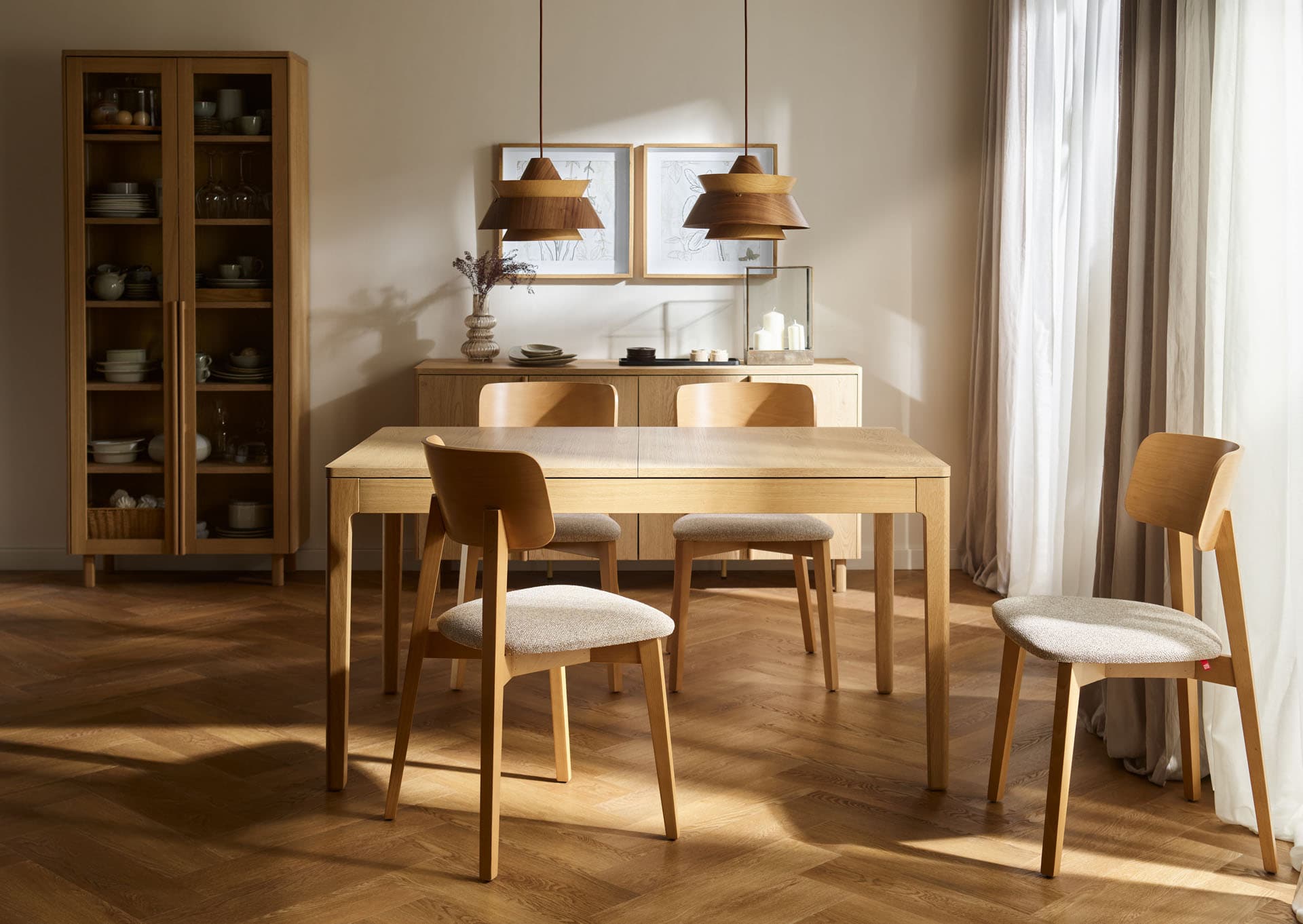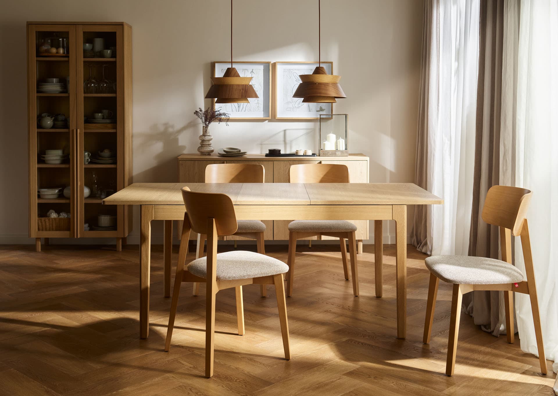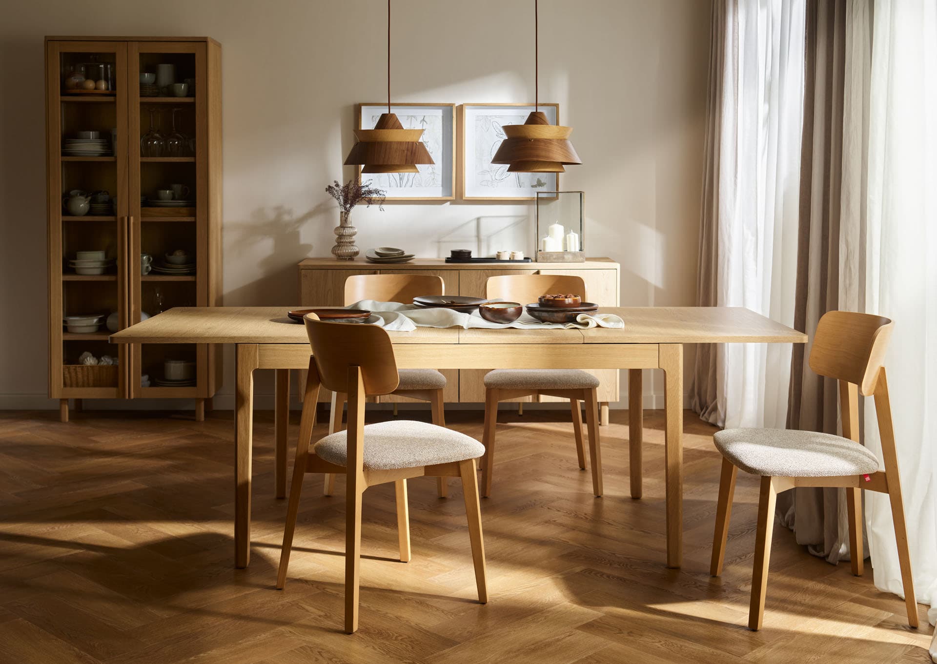 The rectangular extendable table from the Well collection is a functional centerpiece for home gatherings. Thanks to an exceptionally smooth and user-friendly mechanism, it can be extended effortlessly by just one person, quickly expanding to seat up to 10 people. The gently curved tabletop is supported by solid, beautifully finished oak legs and frame, highlighting the natural character of the piece while ensuring lasting durability.