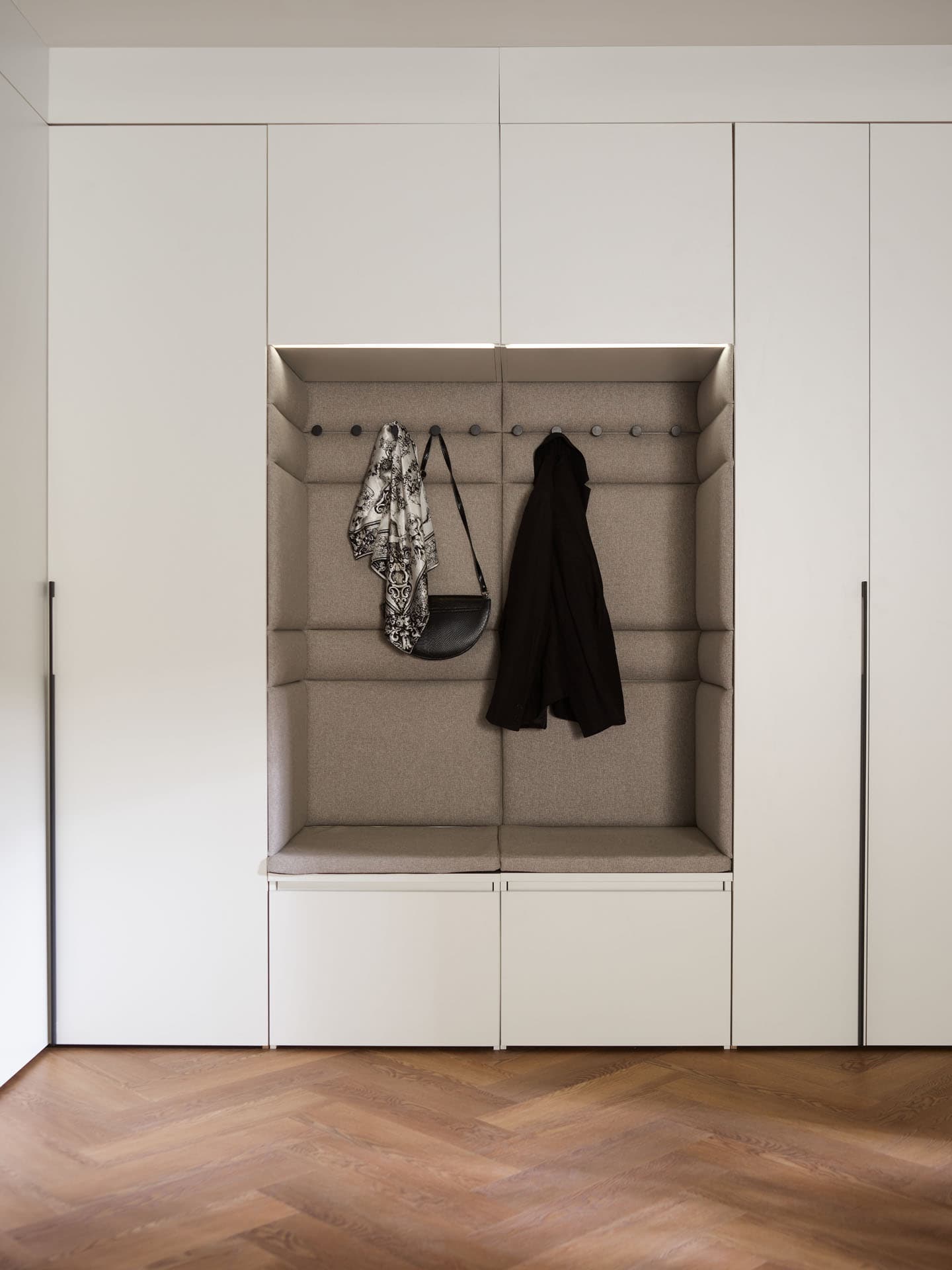 Upholstered panels bring a pleasant feeling of warmth to the interior. They protect the wall from dirt and abrasions, and at the same time allow you to lean back comfortably while putting on or taking off your shoes, making daily preparations for going out easier.