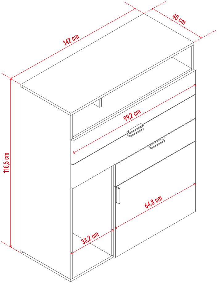 - The buffet will also suit a bedroom, home office or teenager's room. In the drawer and lockable cabinet you will store personal trinkets, and on the open shelves you will set books or decorations.