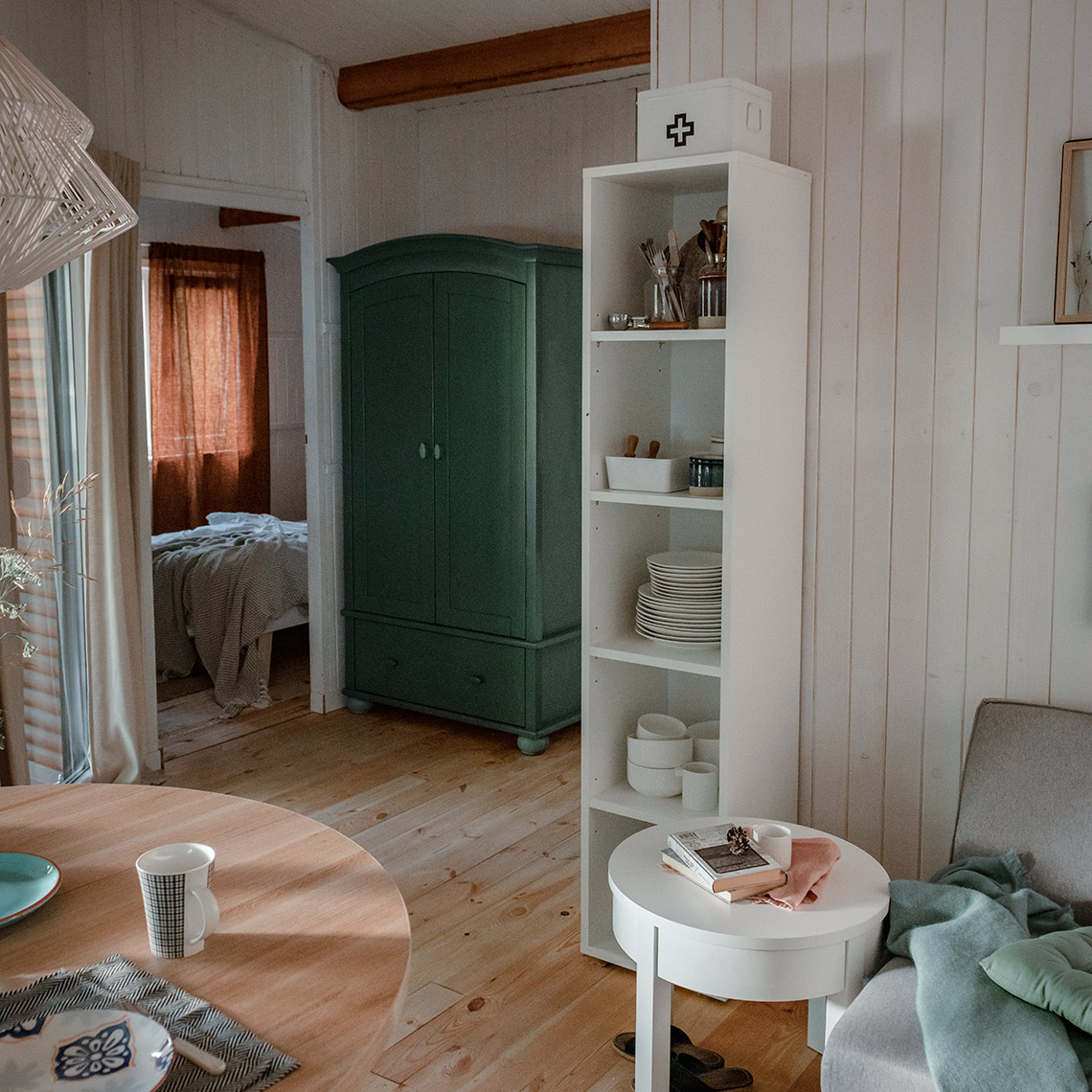 - You can configure Simple furniture with materials of different finishes. Bookcases in oak, white and gray are made of high-quality laminated board. The bookcases in black are made of painted board with a matte lacquer finish.