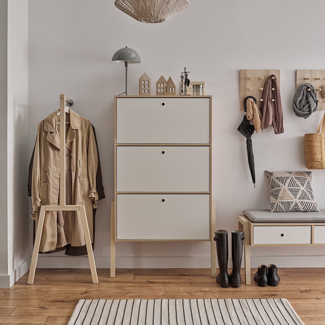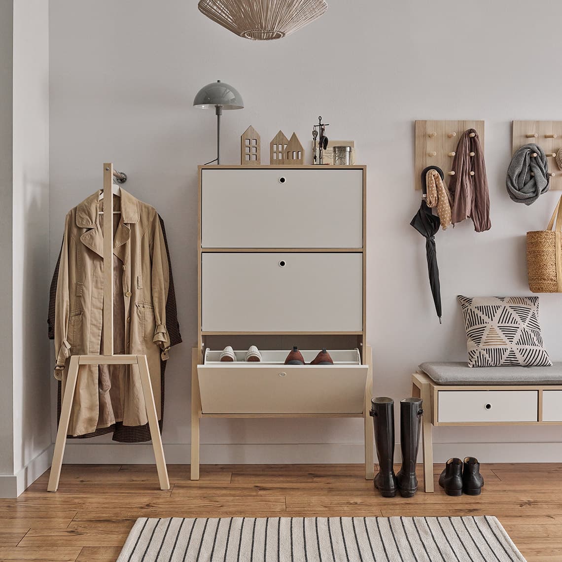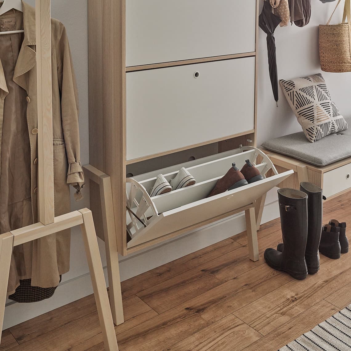 The shoe cabinet from the Spot series is resistant to scratches and minor damage. To clean it, a damp cloth is enough.