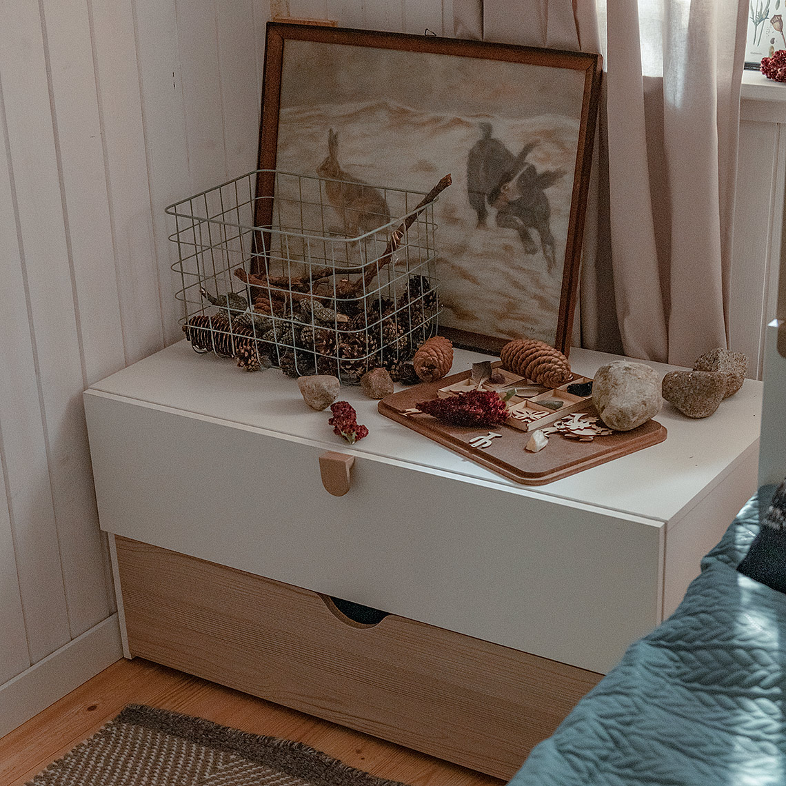 A chest of drawers and a pedestal provides a place to store laundry, toys or sports accessories. It is the base piece of the Stige collection, on which you can place another piece of furniture and get a practical built-in.