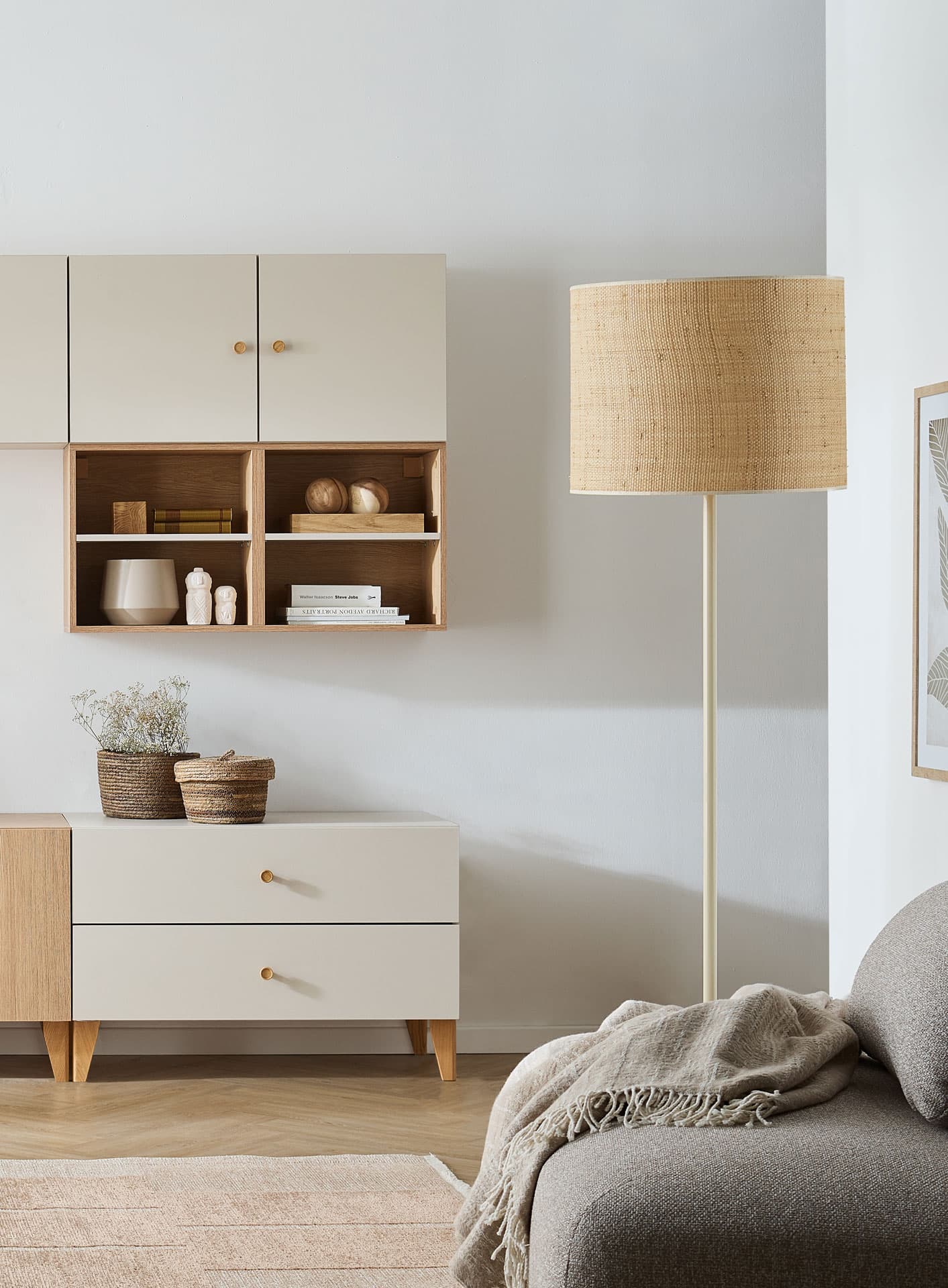 Strapo is a model of a pendant and floor lamp, with a lampshade made of raffia.