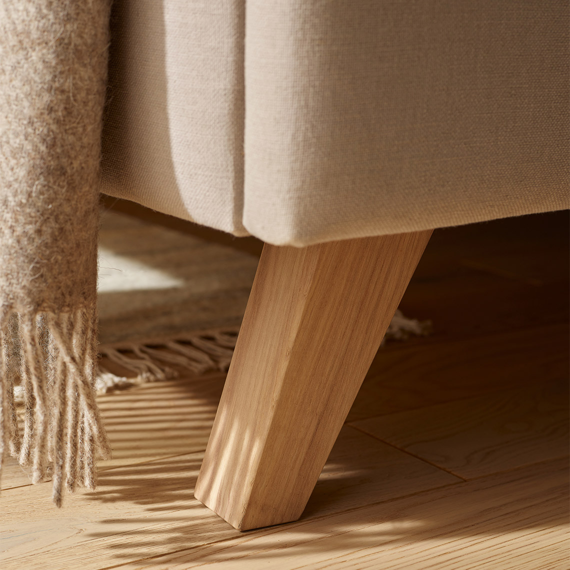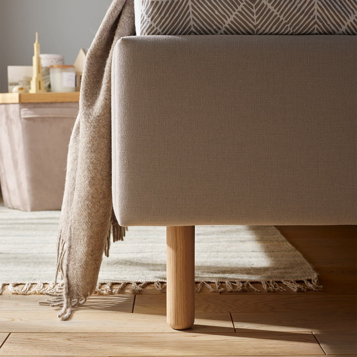 The upholstered backrest is filled with soft foam. The body is made of furniture board, durable and long-lasting, covered with a fabric of your choice. The metal bed frame has spring strips and a gas lift. The structure rests on solid oak, beech or ash wood legs.