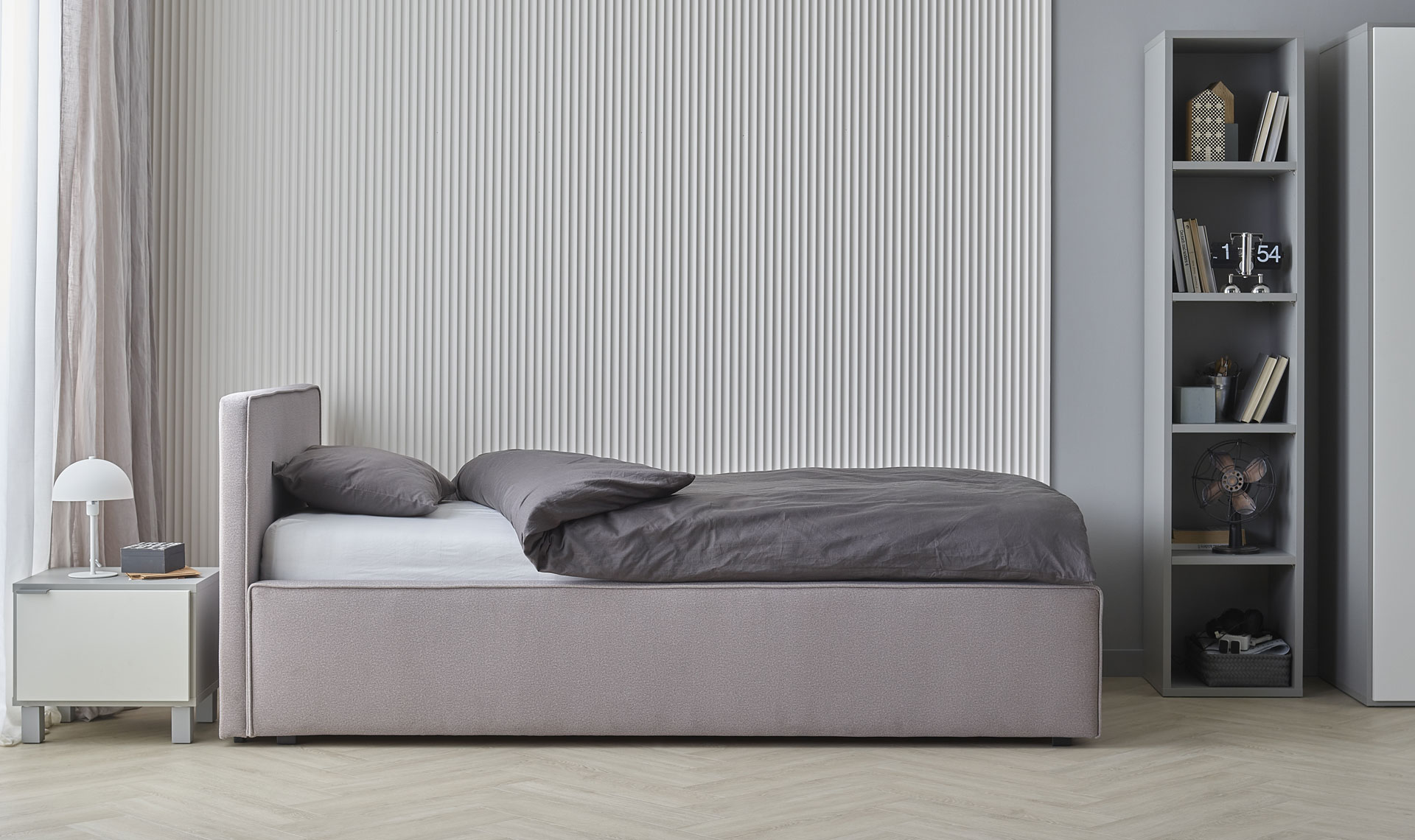 The Nook upholstered bed is the perfect piece of furniture for a child or teenager\'s room. It will be a great companion for playing with friends, reading bedtime books and lazy mornings. The soft headrest provides comfortable support while resting. Its color and type of fabric you can choose yourself to perfectly match the interior.
