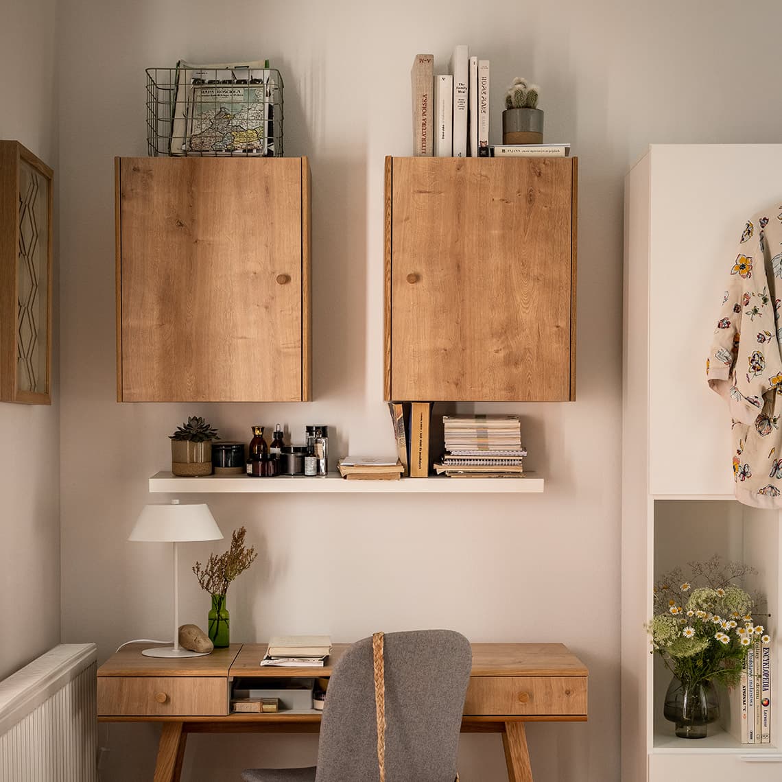 The multifunctional wall cabinet from the Nature collection will work well in the bedroom, as well as in the living room or dining room. You can store in it any items that you want to have at hand, but not necessarily in plain sight. Thanks to its universal design, the piece of furniture will fit perfectly into any arrangement.