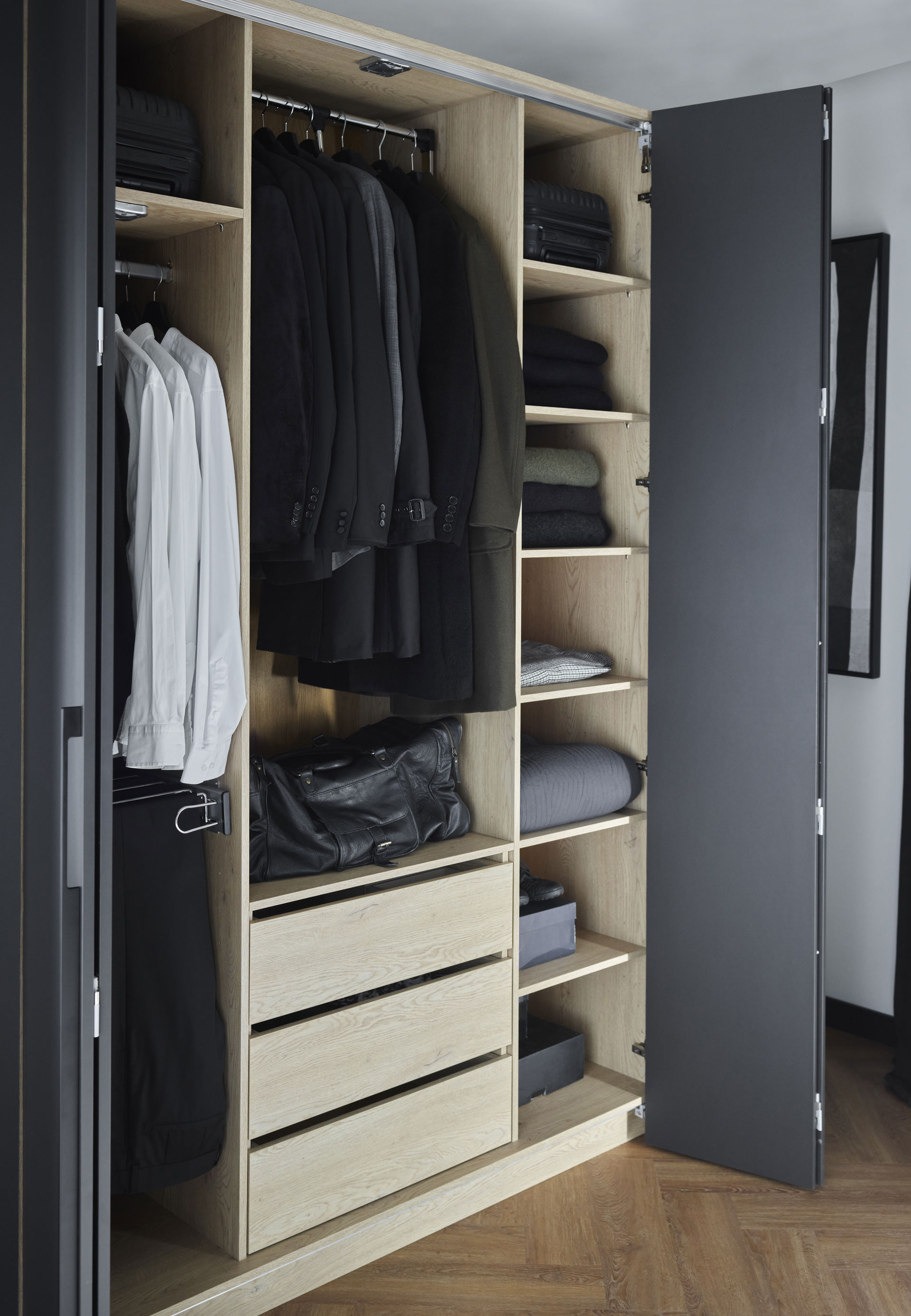 - The interior of the closet can change along with your needs. Just buy a set of 3 shelves or an accessory rack to get additional space for organizing clothes and accessories. By expanding the Stor closet with a side closet with mirror, you can gain even more storage space. An extension in a different color than the closet will provide an interesting visual effect.