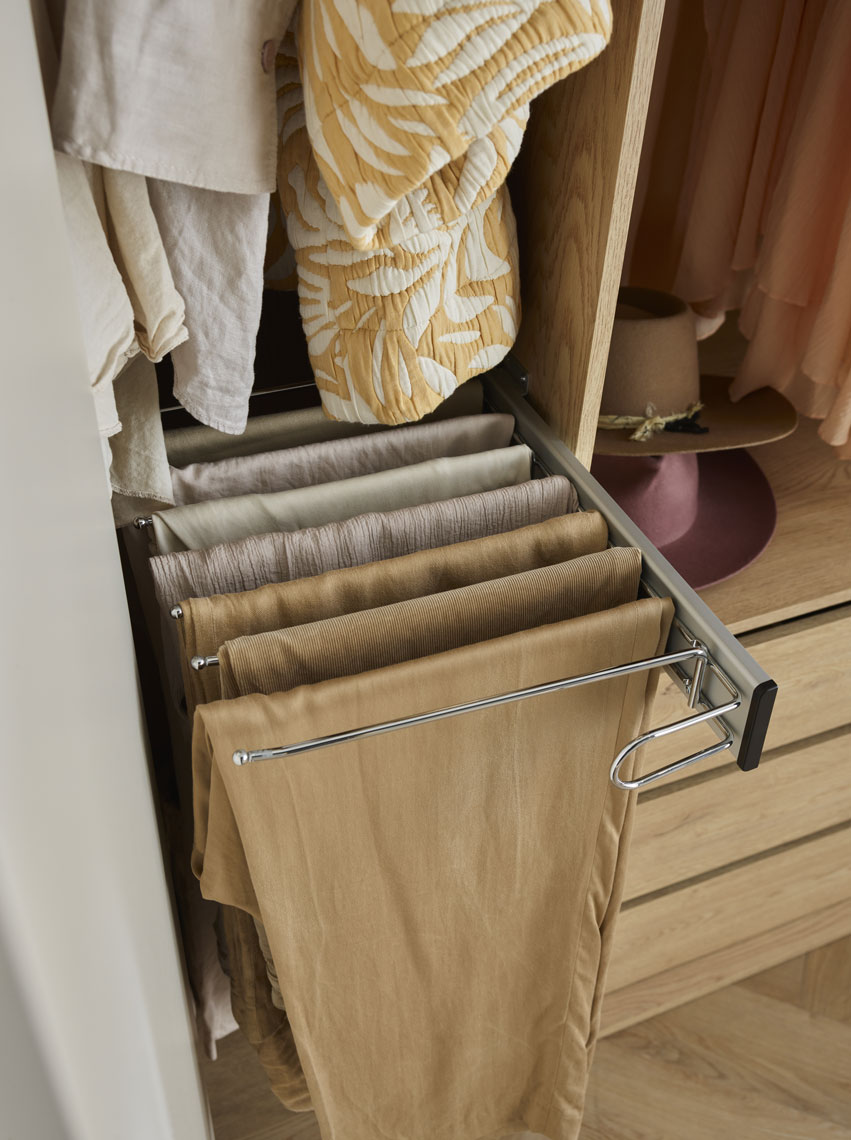 • Within the Easy package, the Stor closet has 3 upper fixed shelves, 5 height-adjustable shelves in the right segment and 2 wider shelves in the middle segment. The closet also includes 2 hanger rods and a pull-out trouser rack.