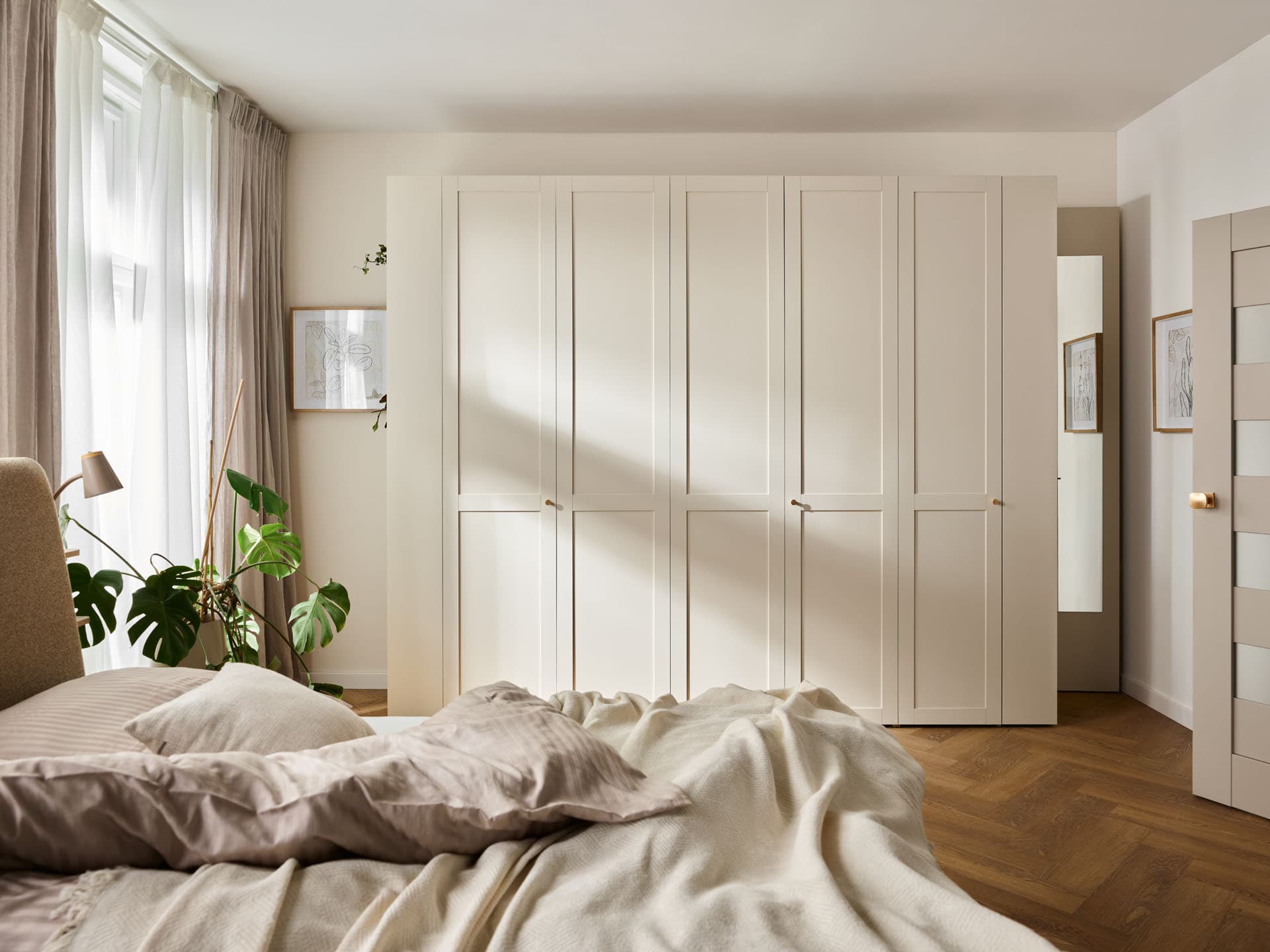 - It can function both as a free-standing piece of furniture and as an aesthetic built-in unit. Masking panels (transverse, top and side) allow the closet to fit perfectly into the interior, eliminating recesses and gaps at the ceiling and on the sides of the furniture. They should be purchased separately and cut to size during assembly.