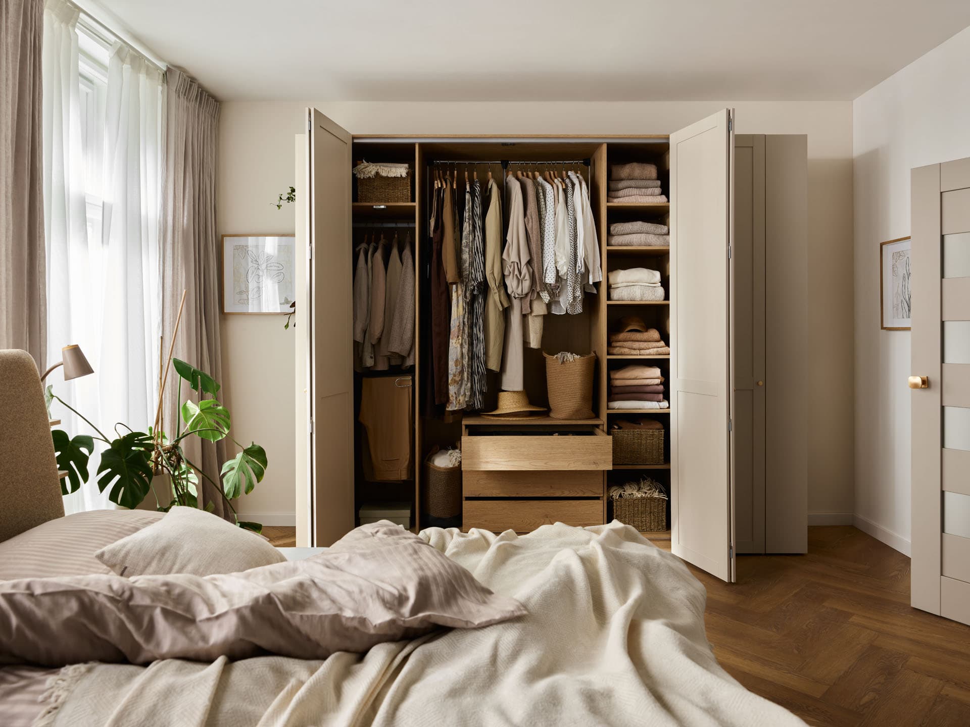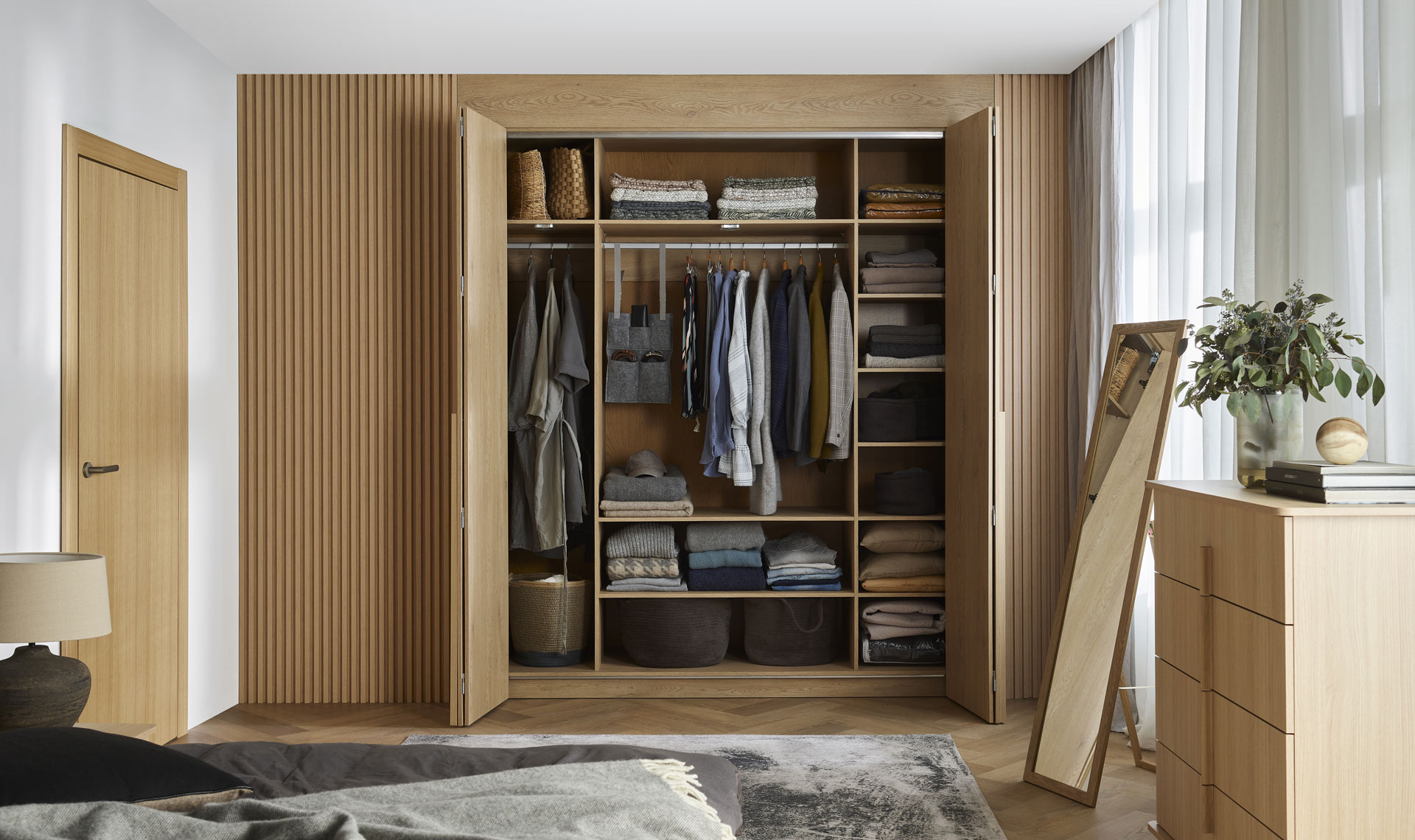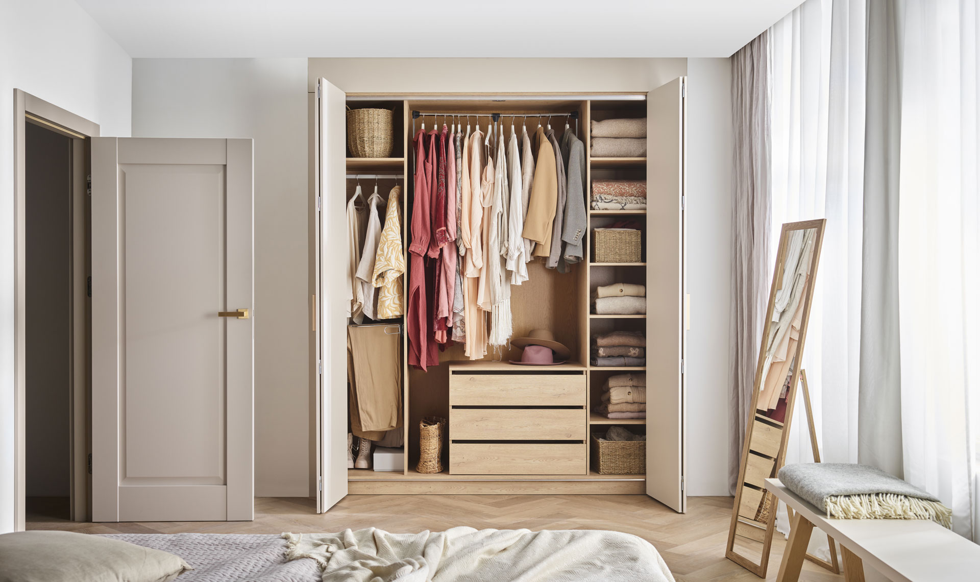 The large 4-door model of the Stor closet can serve as a full-size closet. Behind the accordion doors hides a spacious interior, the furnishings of which you can choose from the available packages or complement individually with additional items. Built-in LED lighting will make it easier to take things out after dark. Thanks to the possibility of personalization, you will create a piece of furniture that will perfectly fit your taste and available space.