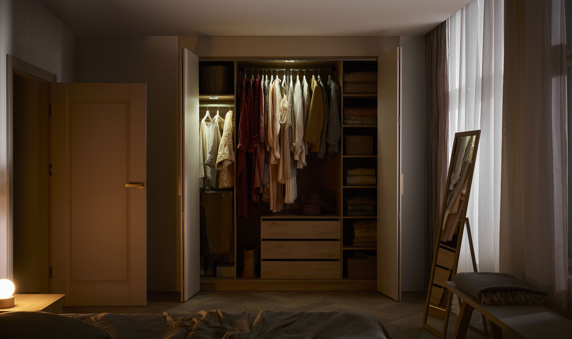 - Inside the closet there are LED lights with a motion sensor, which light up when the door is opened. This makes it possible to take out clothes without illuminating the entire room.