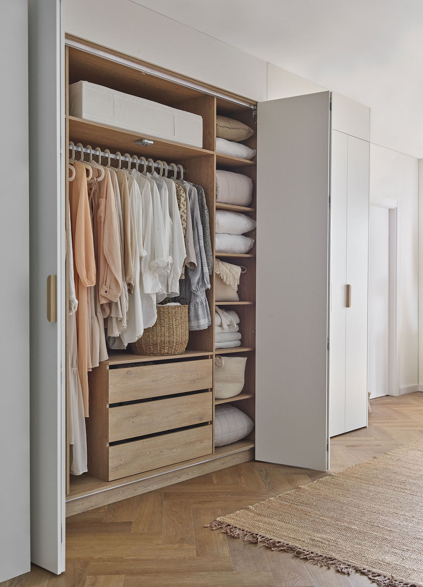 - Depending on the height variant of the furniture, you can choose from 2 or 3 ready-made equipment packages and adjust the interior of the closet to your needs and the nature of the things you store.