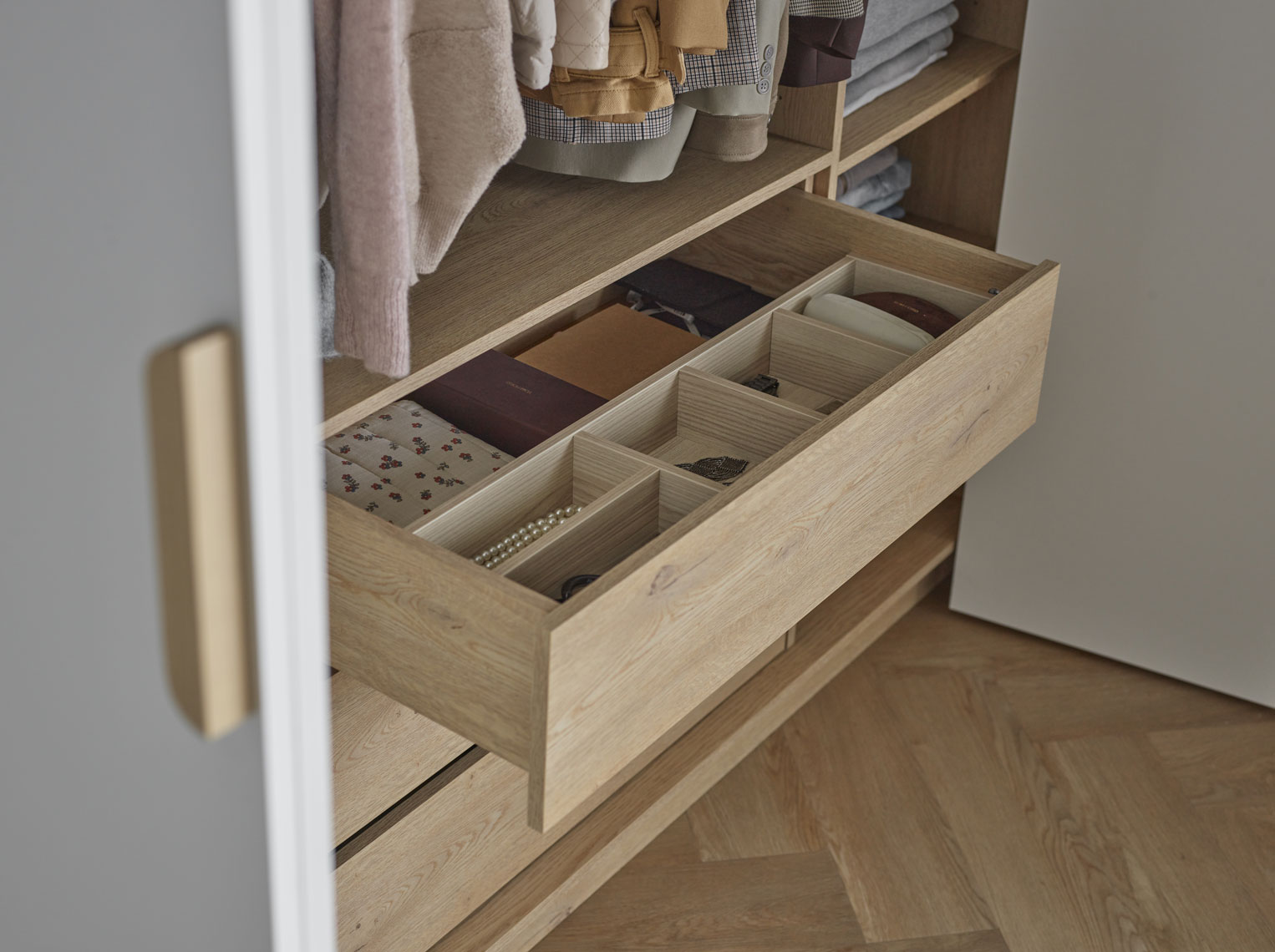 • The body, fronts, dividers and shelves of the wardrobe and drawers (in selected interior packages) are made of high-quality furniture board, which is easy to keep clean. It is resistant to damage and can withstand heavy loads.