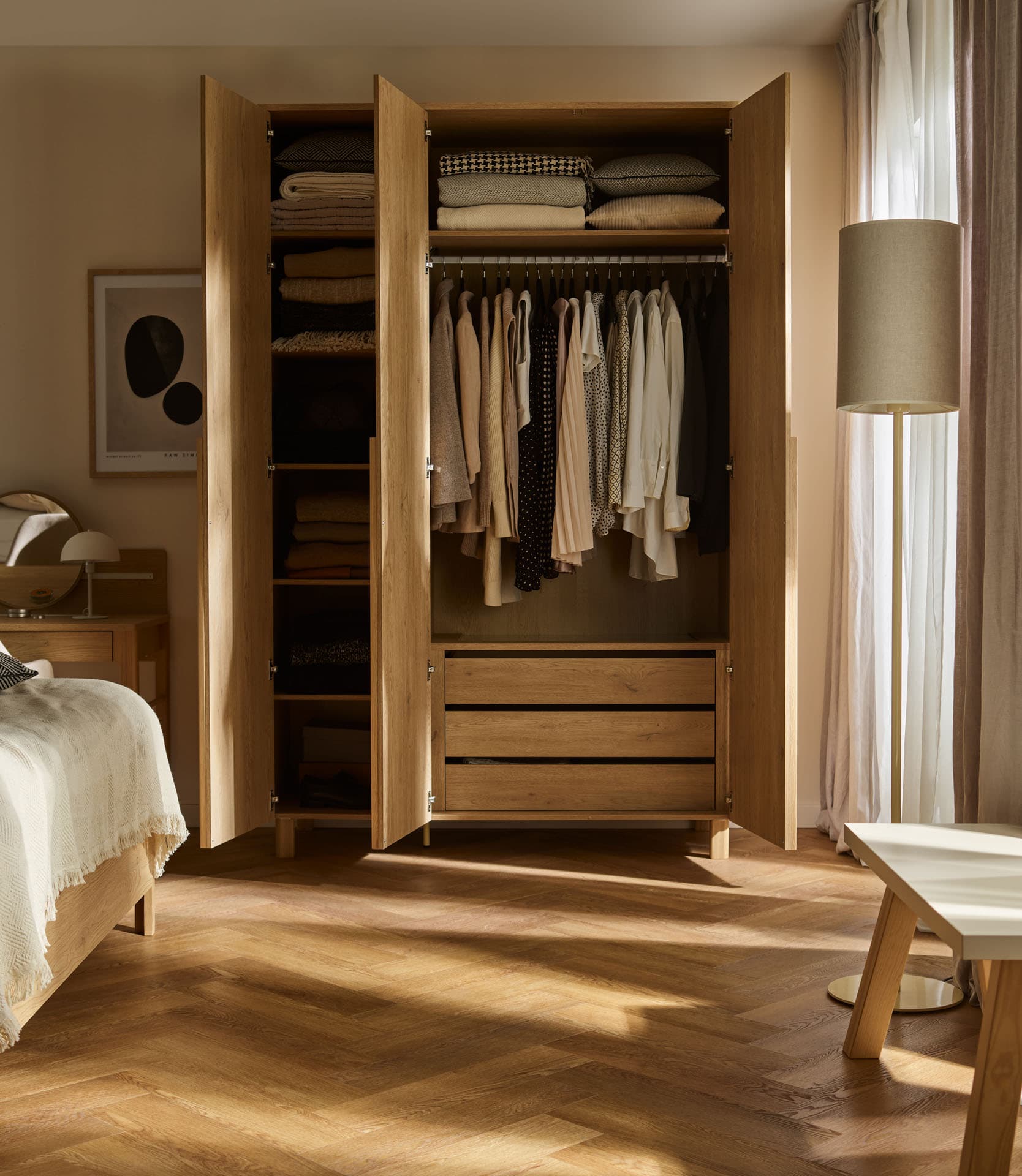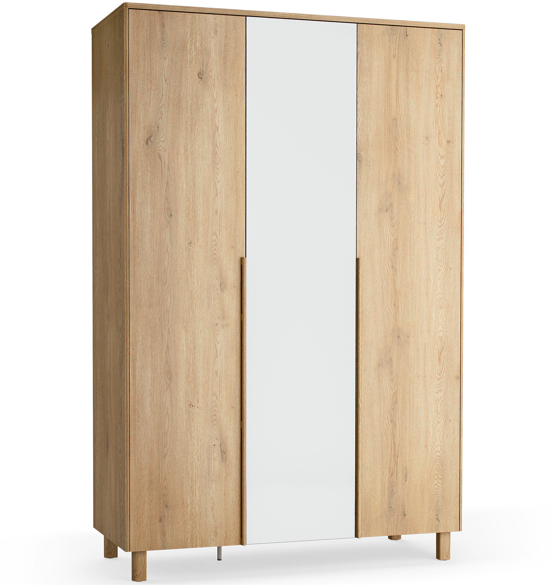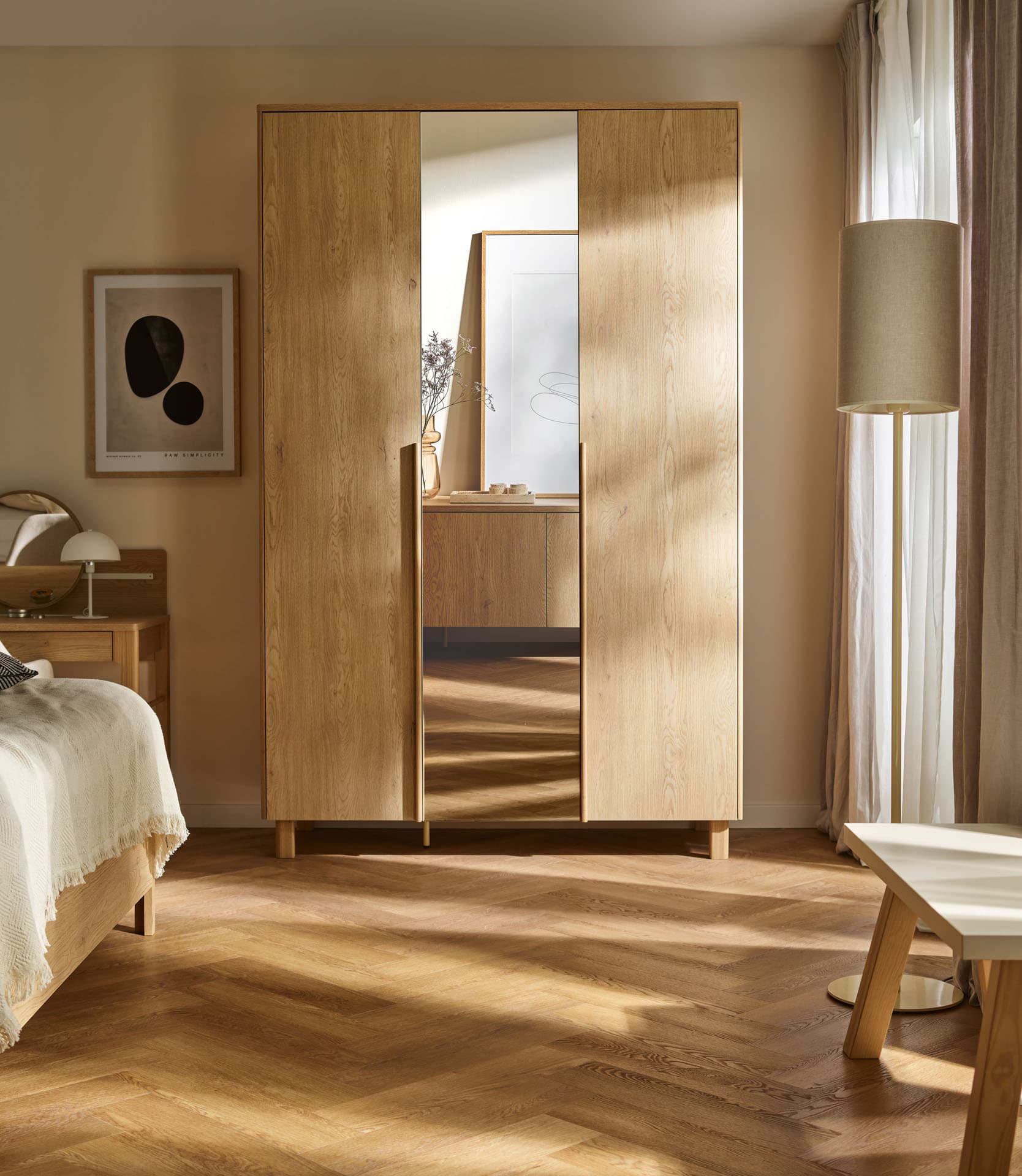 The 3-door wardrobe with mirror and lighting from the Well collection is a functional, capacious storage piece of simple form with natural wood details. Thoughtful division of the interior makes it easy to organize clothes and accessories, and integrated lighting makes the wardrobe more convenient for everyday use. Mirrored doors introduce lightness and light, while allowing you to close the styling without leaving the room.
