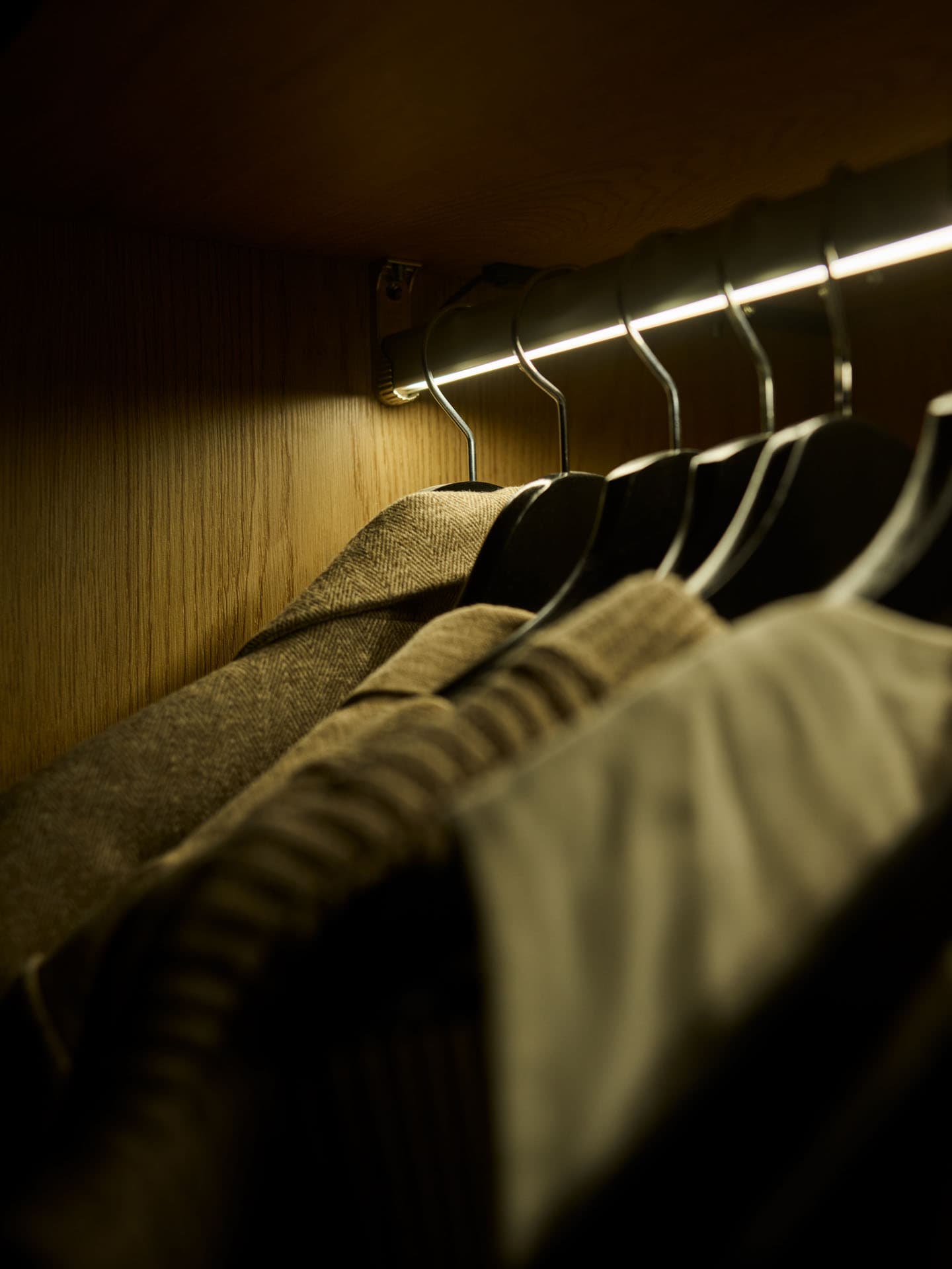 - The right, wider interior section features a shelf with a suspended wardrobe rod and integrated LED lighting.