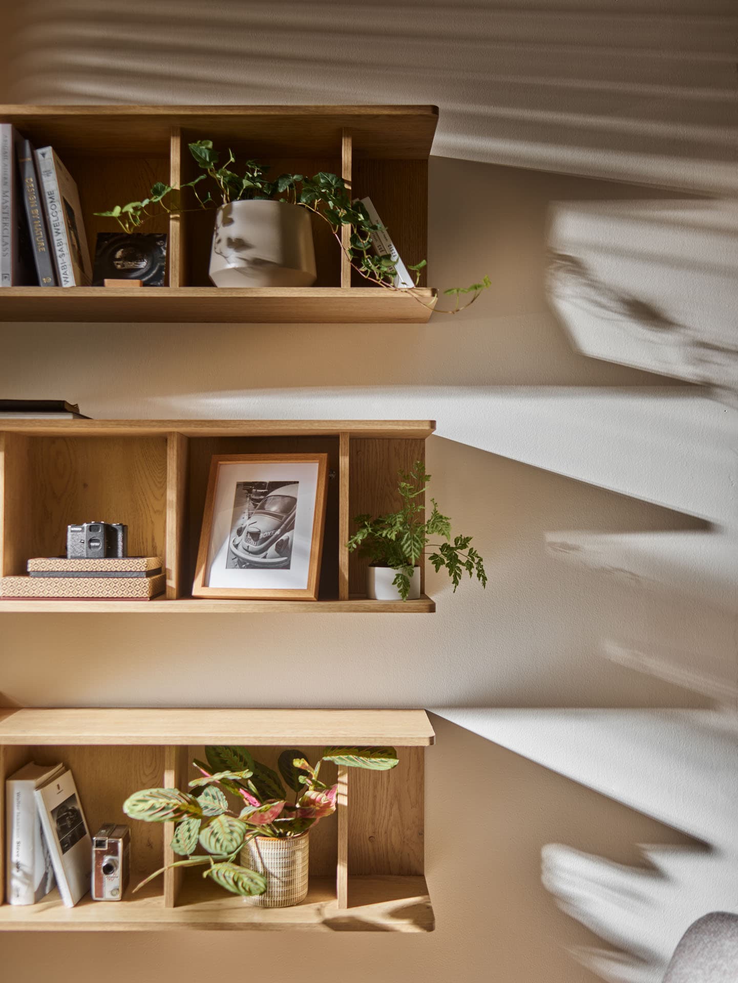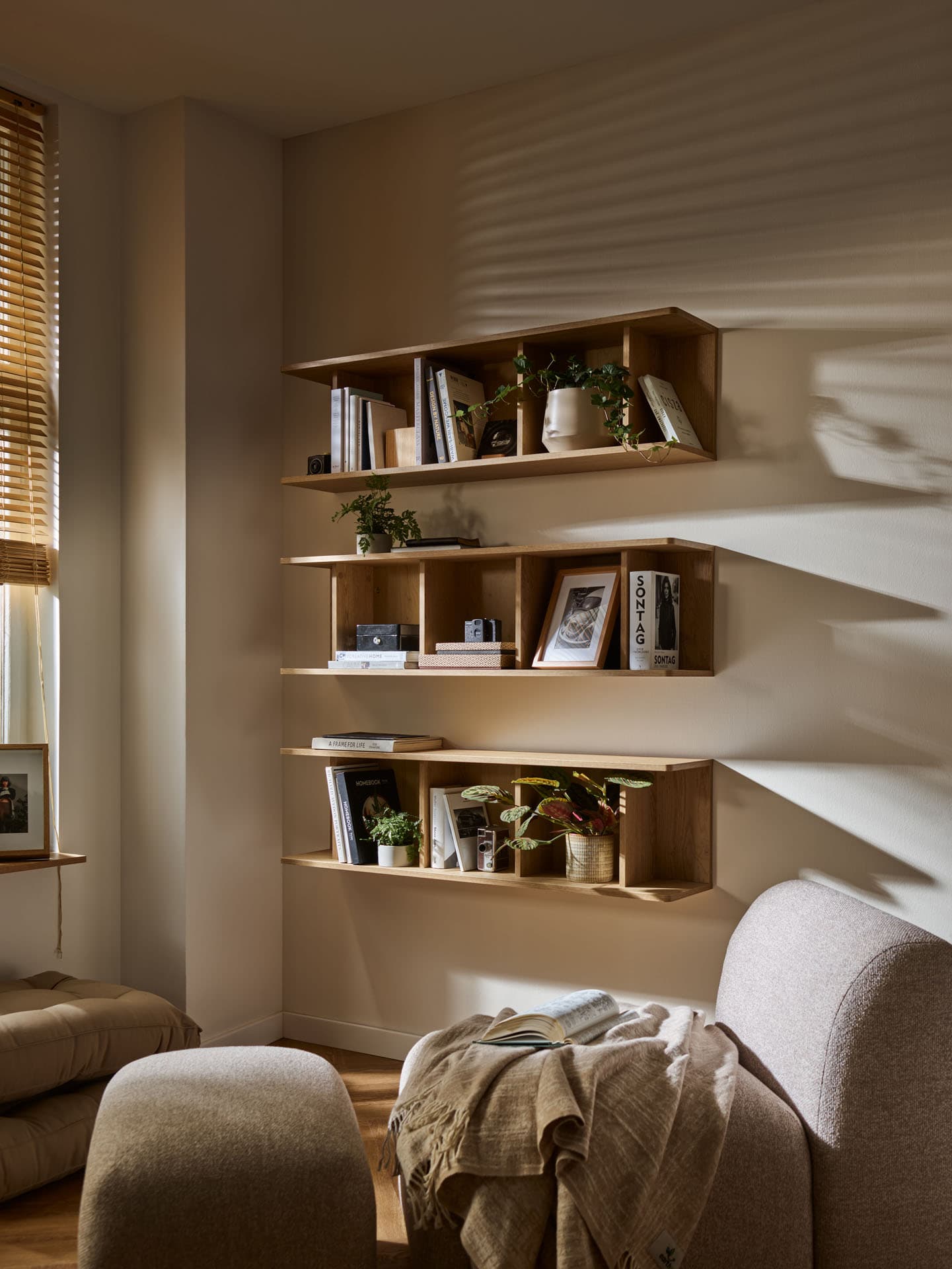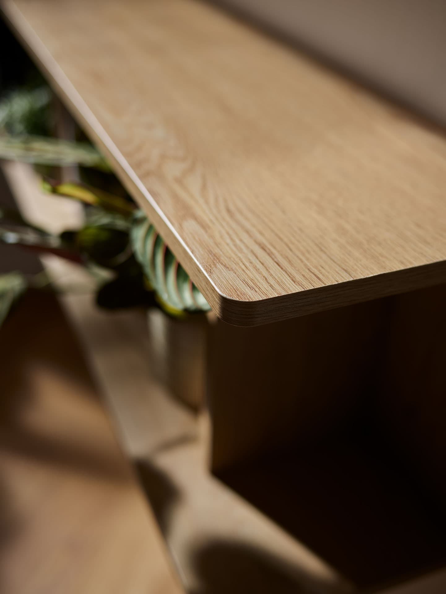 The wide hanging shelf from the Well collection organizes the wall space and allows you to build orderly, rhythmic compositions. Its proportions and oak color have been matched to the other pieces in the collection, making it easy to create a cohesive arrangement in the living room, dining room or bedroom. It is a functional piece that combines storage with aesthetic display.