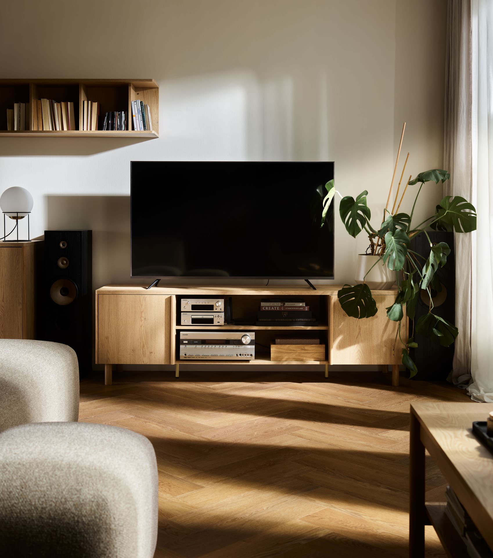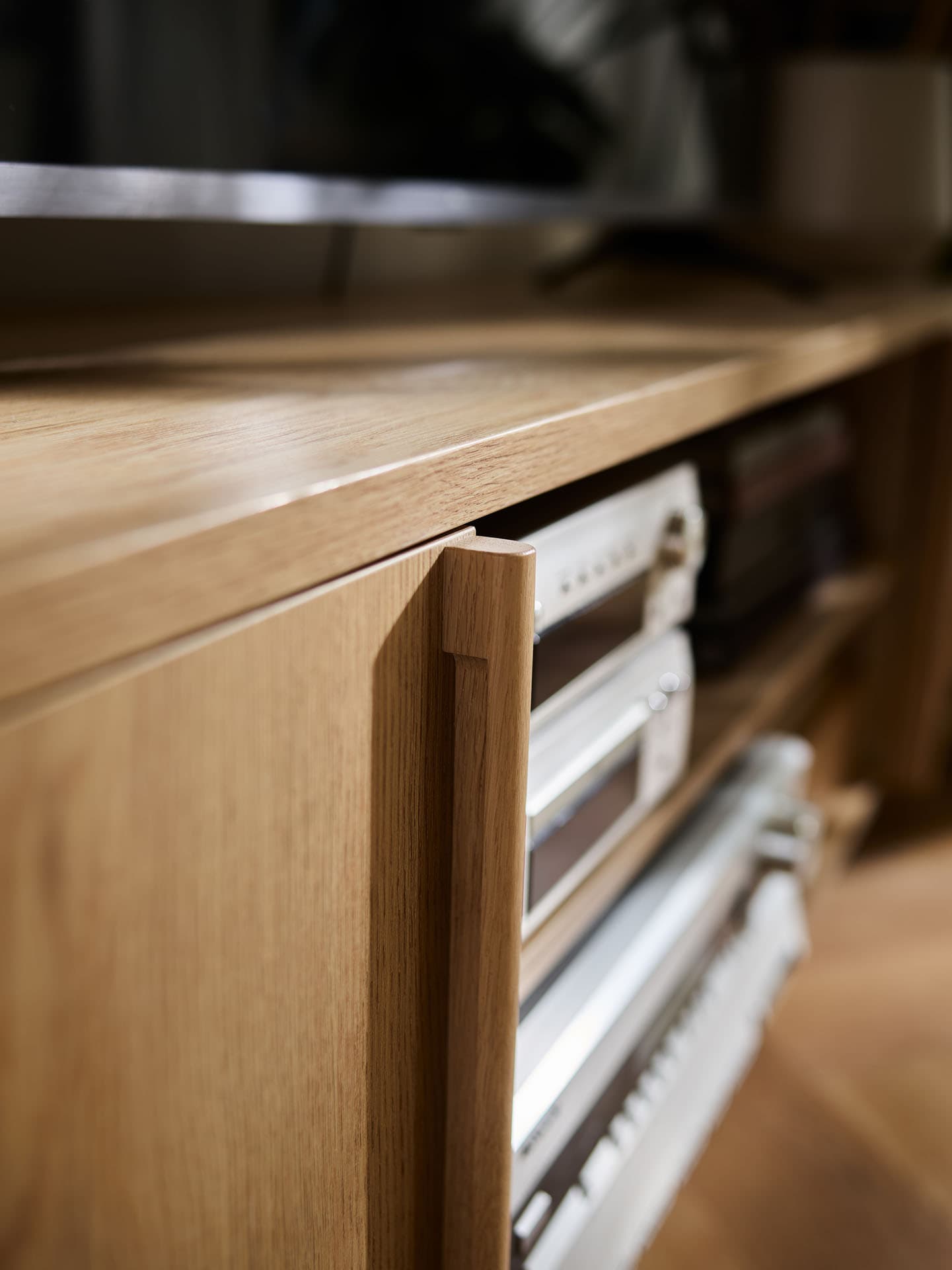 The Well wide RTV wardrobe was designed as a calm, horizontal solid that organizes the multimedia zone and promotes visual order in the living room. The warm shade of wood, softly guided lines and balanced proportions make the piece of furniture not dominate the interior, but naturally complements it, creating a background for daily relaxation. The form of the cabinet is based on subtle curves and carefully designed details.