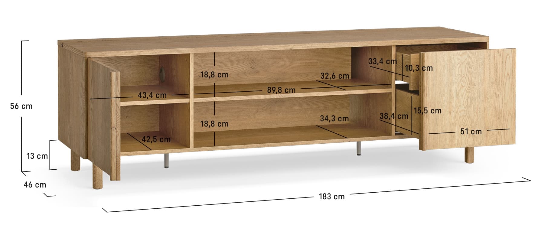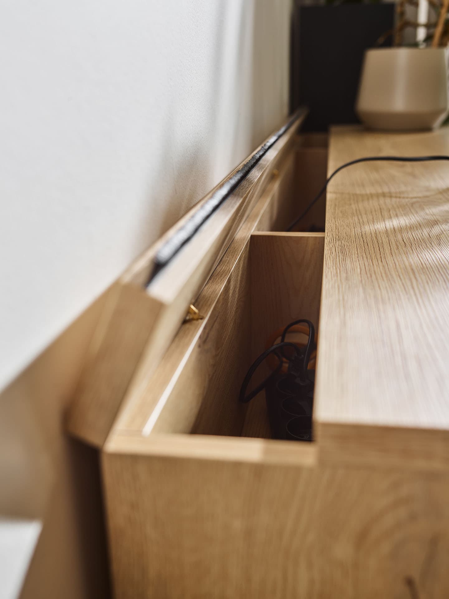 - An additional convenience is the toolbox located at the back of the cabinet, allowing to aesthetically hide the extension cord and organize cables, so that the multimedia zone remains visually clean.