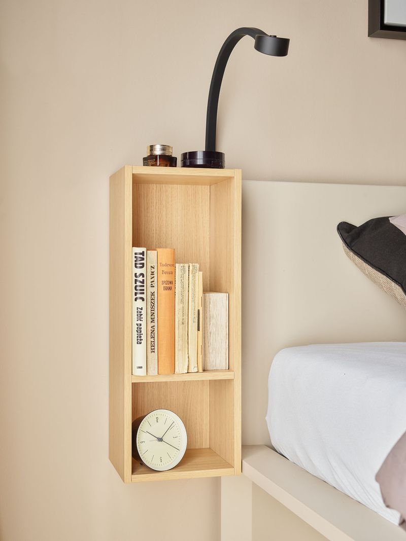Równie dobrze w funkcji stolika nocnego sprawdzi się wisząca półka. Należy przymocować ją do ściany na wysokości, która pozwoli na komfortowe dosięganie do niej z pozycji leżącej. Taki mebel nie zajmie dodatkowej przestrzeni w sypialni, a będzie urzekać swoim oryginalnym zastosowaniem.