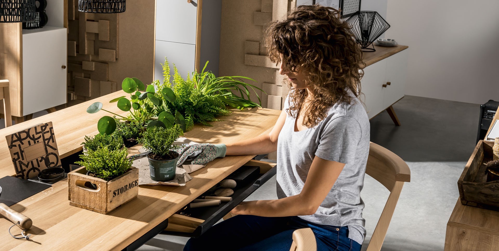 Porządek w naszej jadalni znacznie prościej będzie nam utrzymać z funkcjonalnym stołem Nature. Nie tylko posiada aż sześć szuflad na drobiazgi, ale także został wyposażony w praktyczną wnękę biegnącą przez całą długość blatu. To idealne miejsce na świeże zioła, przyprawy czy świeczniki.