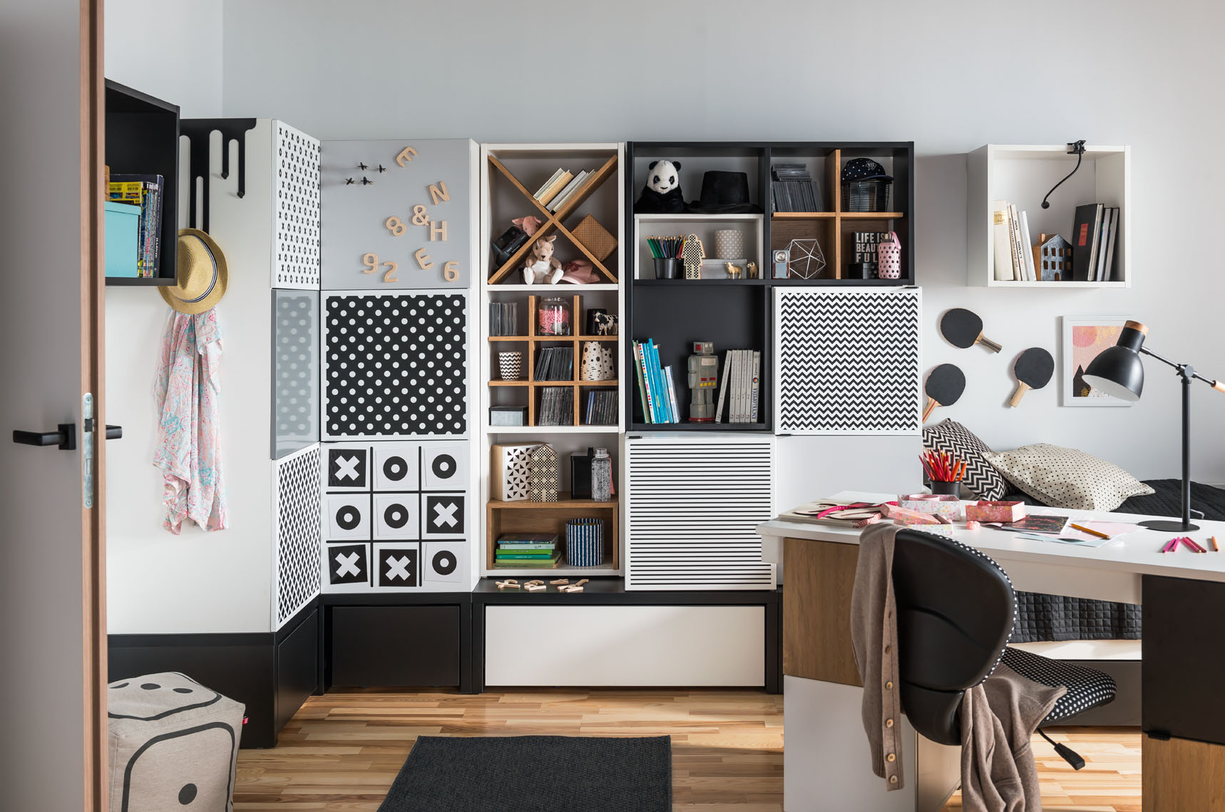 W pokoju młodzieżowym (gdzie bałagan zawsze przecież „robi się sam”), świetnie sprawdzą się meble z kolekcji Young Users. Pojemne szafy i regały posiadają sprytne podesty z mobilnymi szufladami, które wygodnie możemy przesuwać w dowolny kąt. Ułatwią zarówno gruntowne porządki, jak i szybkie uprzątnięcie pokoju przed wizytą znajomych. Modułowa konstrukcja mebli Young Users sprawia, że łatwo możemy rozbudować je o kolejne elementy, gdy z czasem zacznie brakować miejsca do przechowywania nastoletnich skarbów.