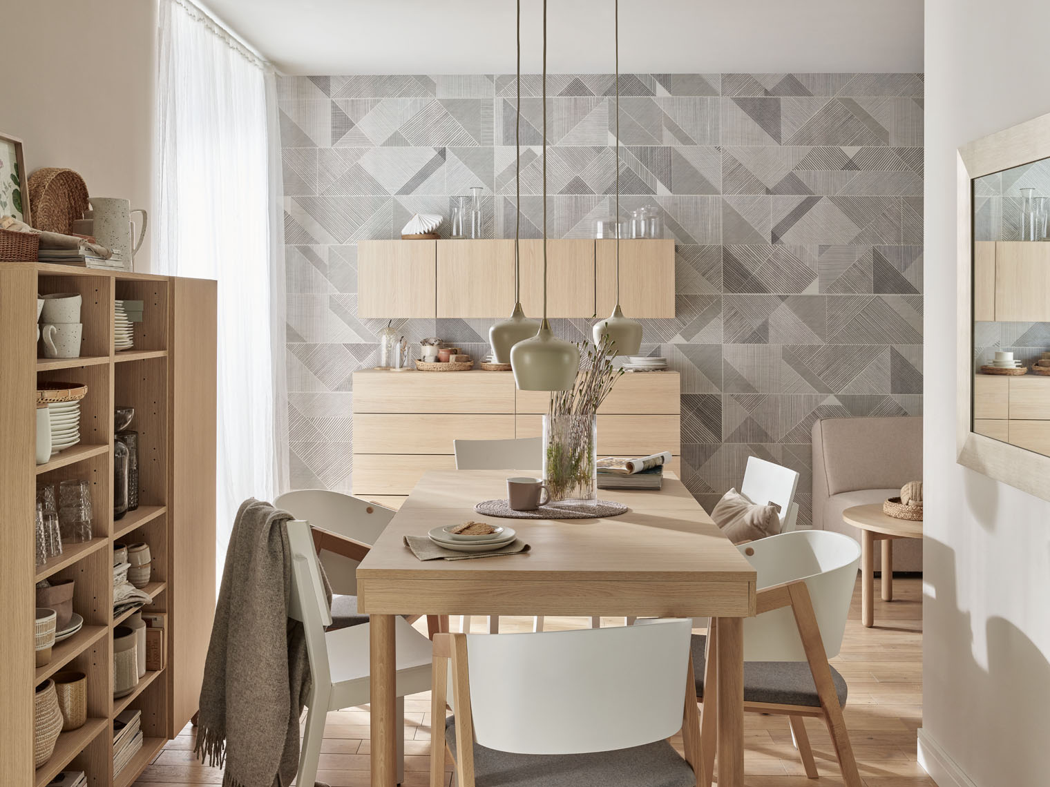 Równie ważne będzie wykończenie ścian w jadalni. Warto je udekorować, by zapewnić chwilom przy stole efektowną oprawę. Oprócz tradycyjnych obrazów do wyboru mamy także wiszące lustra, które optycznie powiększą przestrzeń, oraz rozmaite panele ścienne – wzorzyste i niezwykle wytrzymałe, trójwymiarowe lamele czy tapicerowane o przyjemnie miękkiej powierzchni.