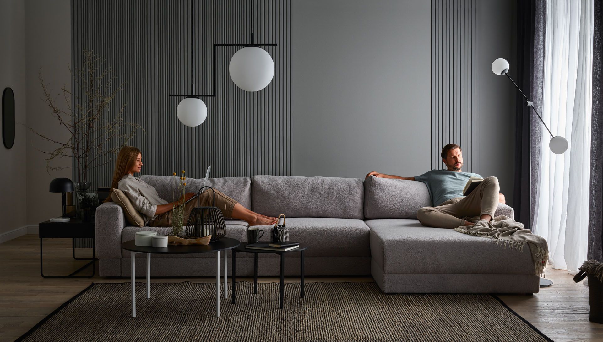 Właściciele nieco mniejszych przestrzeni mogą wybrać oprawę sufitową Libra, która dobrze wygląda zarówno solo, jak i w zestawieniu z pozostałymi modelami z kolekcji. W salonie, w którym centralne oświetlenie znajduje się nad stołem, wyspą lub stolikiem kawowym, pierwsze skrzypce może za to zagrać asymetryczna lampa Zac składająca się z dwóch kulistych kloszy.