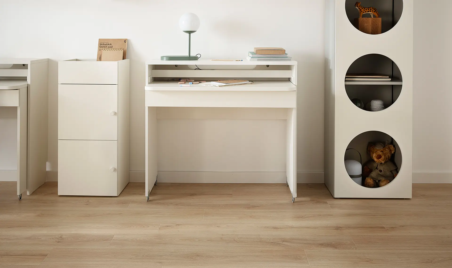 Wnętrze dodatkowo pomoże rozświetlić również podłoga. W ciemnym pomieszczeniu możemy ułożyć np. odbijające światło łagodne, miodowe panele, naturalne deski z jasnego dębu lub szare panele winylowe. W parze z białymi lub beżowymi ścianami sprawią, że cała aranżacja będzie niezwykle lekka, a pokój będzie się przy tym wydawać nieco większy niż w rzeczywistości. Efekt podkreślą też jasne listwy podłogowe, najlepiej z komorą na kable – w ten sposób nawet w zupełnej ciemności nie potkniemy się o splątane przewody.