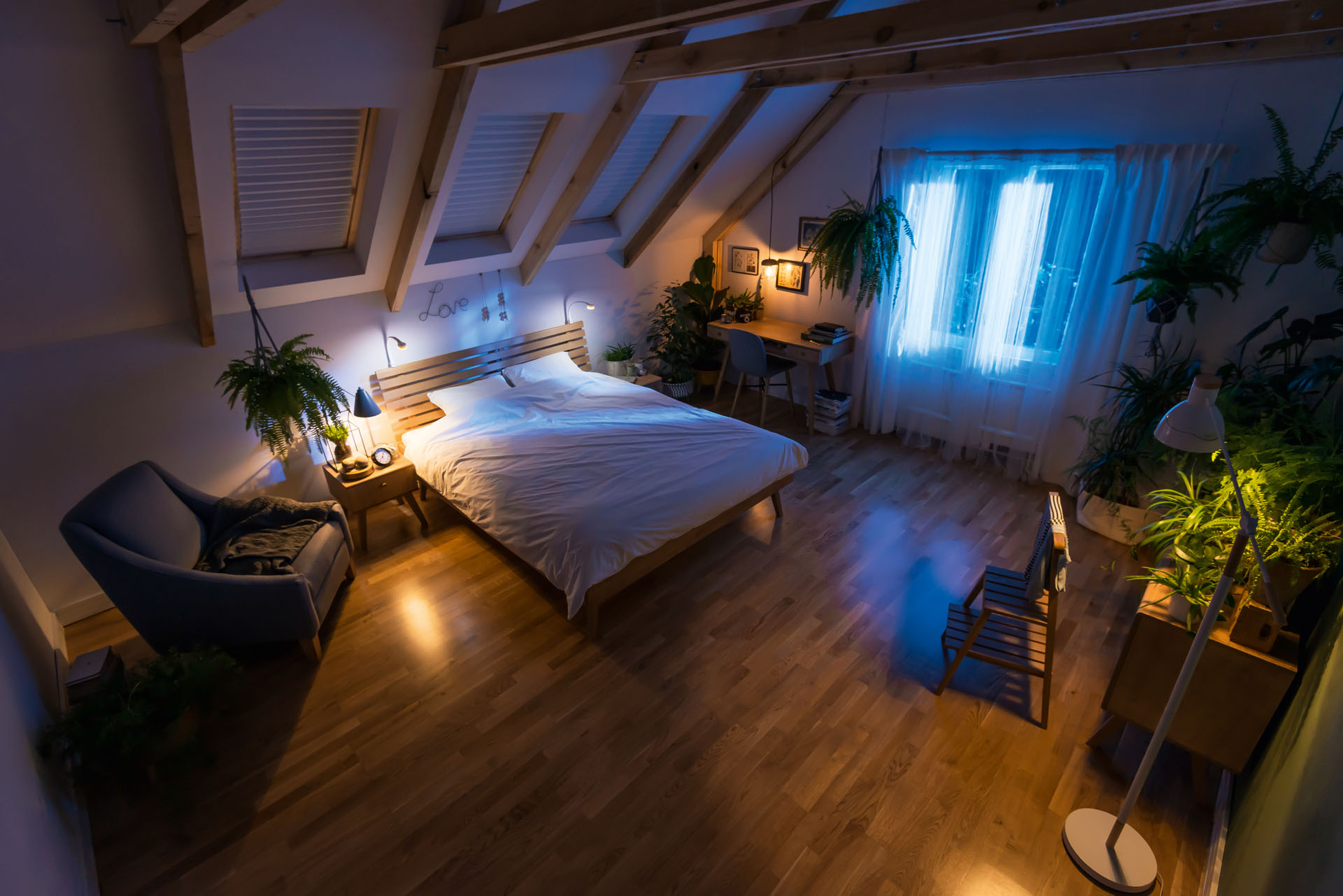 Choć w niektóre noce naszą sypialnię na poddaszu skutecznie rozświetli nawet księżyc, nie zawsze możemy polegać na jego mlecznym blasku. Warto więc zadbać o odpowiednie oświetlenie. W obliczu skosów i niskiego sufitu, wisząca lampa niekoniecznie będzie dobrym rozwiązaniem. Zdecydowanie lepiej będzie postawić na kilka mniejszych punktów świetlnych: stojącą lampę, małą lampkę komodową lub ułatwiającą czytanie elastyczną lampkę LED z portem USB umożliwiającym ładowanie telefonu.