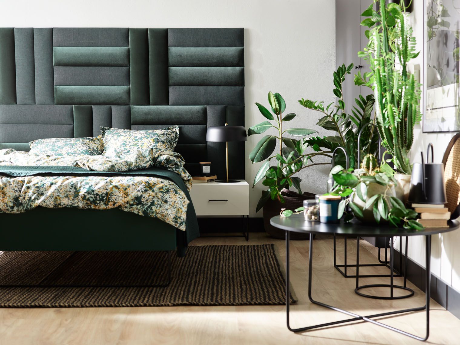Ustawione w centrum zielone łóżko tapicerowane Geometric to dobry pomysł na aranżację sypialni z naturą w roli głównej. Wrażenie jej bliskości spotęgują umieszczone we wnętrzu rośliny, dekoracyjna ceramika o organicznych kształtach, naturalny dywan z juty i drewniana podłoga. Dla dopełnienia aranżacji sypialni warto dobrać pościel z botanicznym motywem. Udaną bazą dla całości będzie neutralna, beżowa ściana.