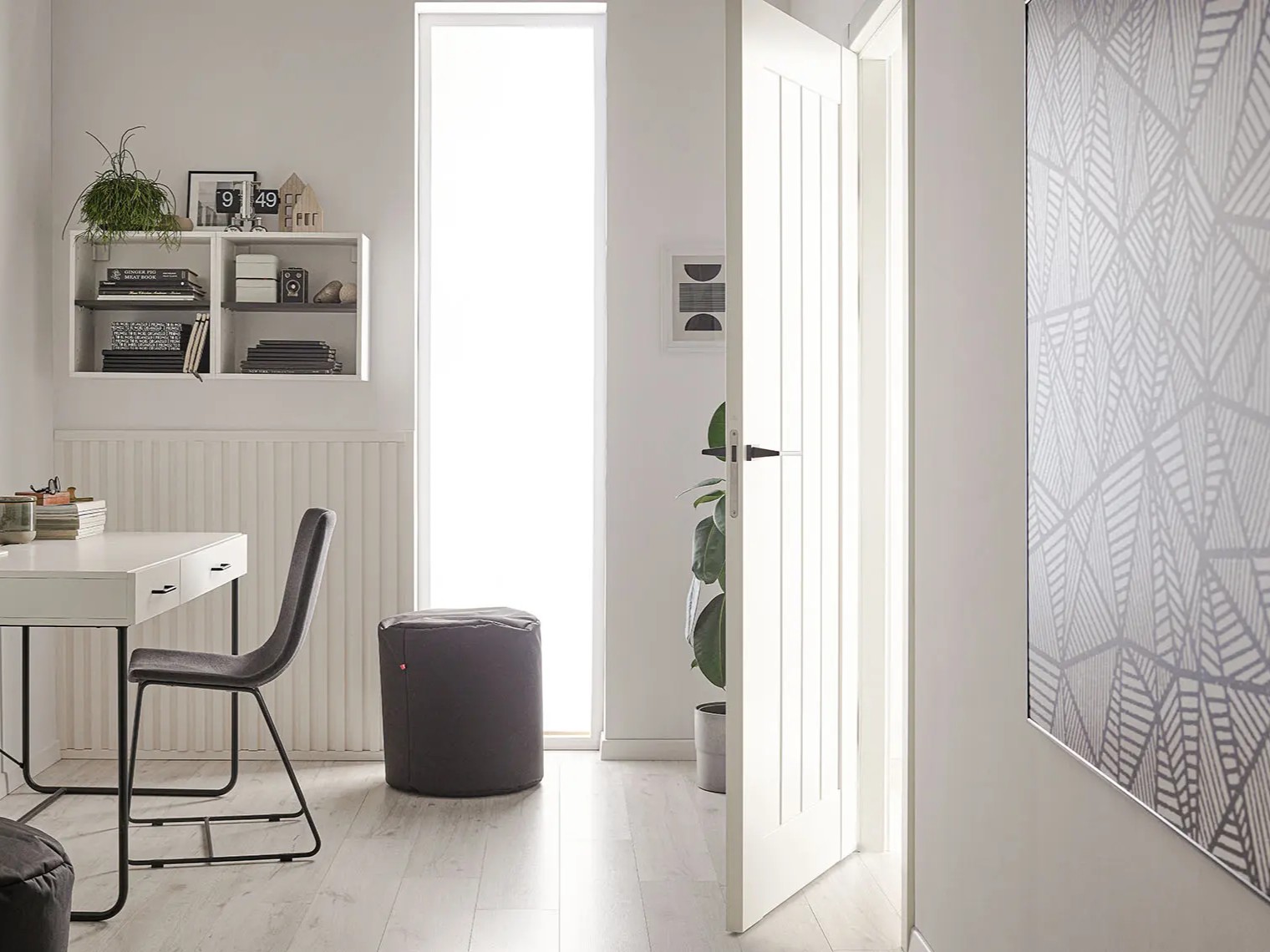 Barwa drzwi wewnętrznych może też stać się doskonałym uzupełnieniem oświetlenia naszych wnętrz. Odczujemy to zwłaszcza w przedpokoju – pomieszczeniu, które często jest pozbawione dopływu promieni słońca. Białe drzwi pomogą rozjaśnić wnętrze jeszcze skuteczniej, gdy wybierzemy skrzydła z przeszkleniami. To właśnie przez nie będzie przedostawać się światło z innych pomieszczeń. W sypialni, gabinecie lub pokoju młodzieżowym sprawdzą się na przykład drzwi Inovo, z różnymi wariantami przeszkleń wykończonymi w mlecznym, matowym kolorze. Pomogą rozświetlić przedpokój, jednocześnie zapewniając mieszkańcom niezbędną prywatność. Szerokość i umiejscowienie szklenia możemy dopasować na przykład do pozycji okna wewnątrz pokoju – tak, by przez drzwi mogło przedostać się możliwie jak najwięcej światła.