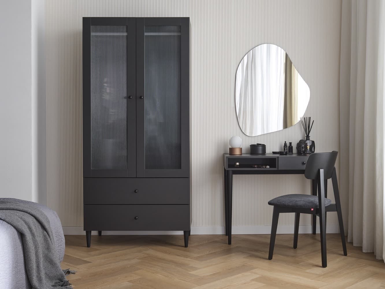 Czarne meble to mocny akcent w sypialni. W ofercie VOX znajdziemy wiele propozycji, które idealnie wpiszą się w ten trend. Czarna szafa 2-drzwiowa Creative z przeszklonymi drzwiami, postawiona na tle jasnej ściany, będzie prezentować się niezwykle elegancko, a jednocześnie pozwoli na wyeksponowanie ulubionych przedmiotów.