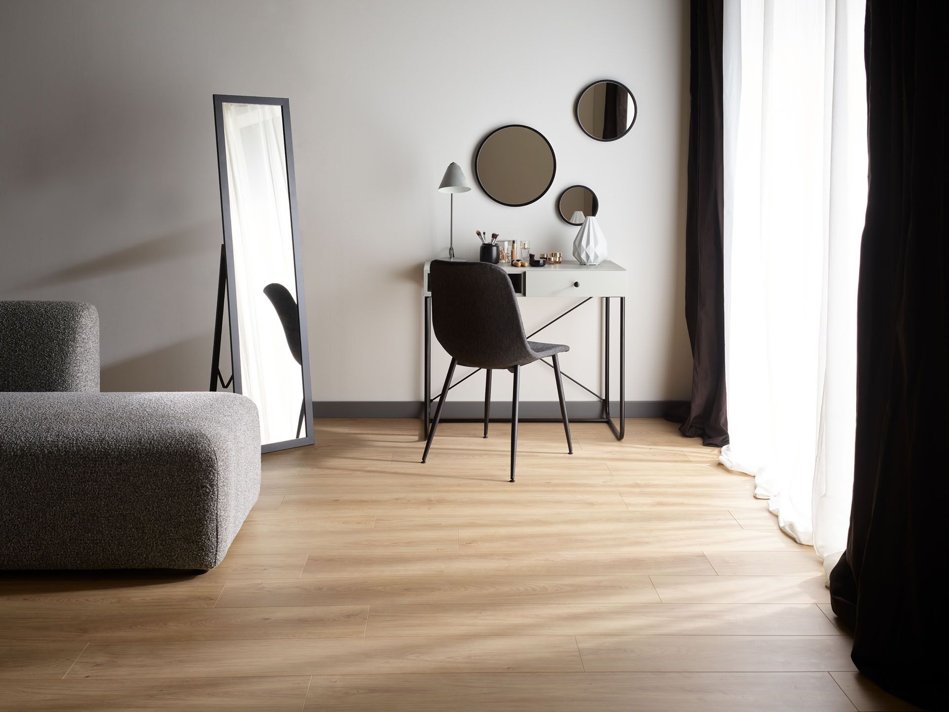 Chociaż ciemne sypialnie zyskują na popularności, to nasza wcale nie musi być zanurzona w czerni, aby panował w niej kameralny klimat. Jeśli obawiamy się ponurego efektu, wystarczą detale np. w postaci czarnego zagłówka czy ciemnej listwy przypodłogowej Espumo. Wraz z nimi uzyskamy wyrazisty kontrast, zachowując przy tym lekkość aranżacji.