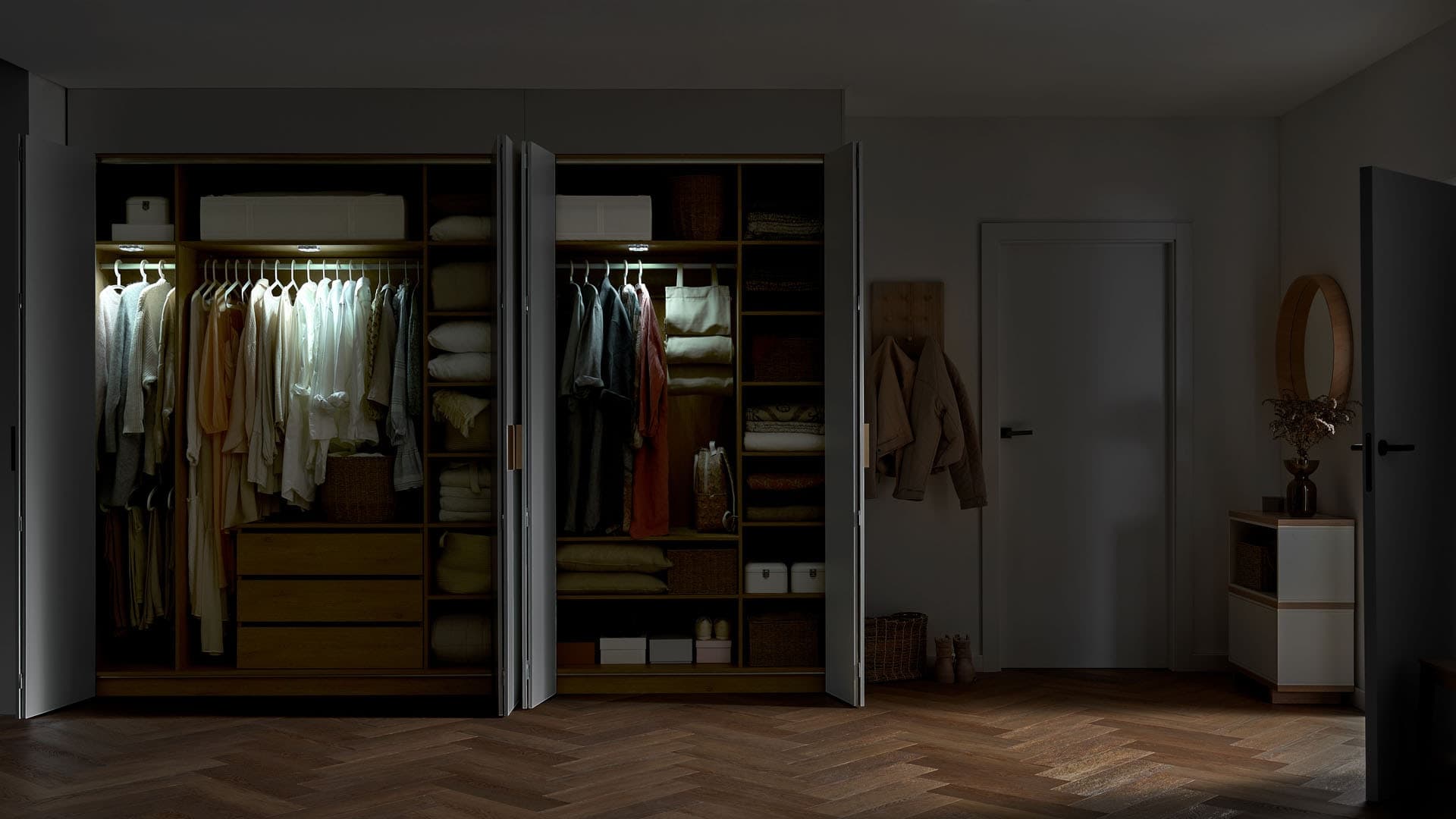Aranżując garderobę, zadbajmy o to, aby znalazło się w niej odpowiednie oświetlenie. Wybierzmy meble z wbudowanym podświetleniem lub rozważmy zainstalowanie bezprzewodowych lampek LED z czujnikiem ruchu, które uruchomią się automatycznie, gdy otworzymy fronty. Garderoba w osobnym pomieszczeniu to też świetna okazja do tego, by przed główną szafą zainstalować reflektorki punktowe, które równomiernie doświetlą półki i drążki.