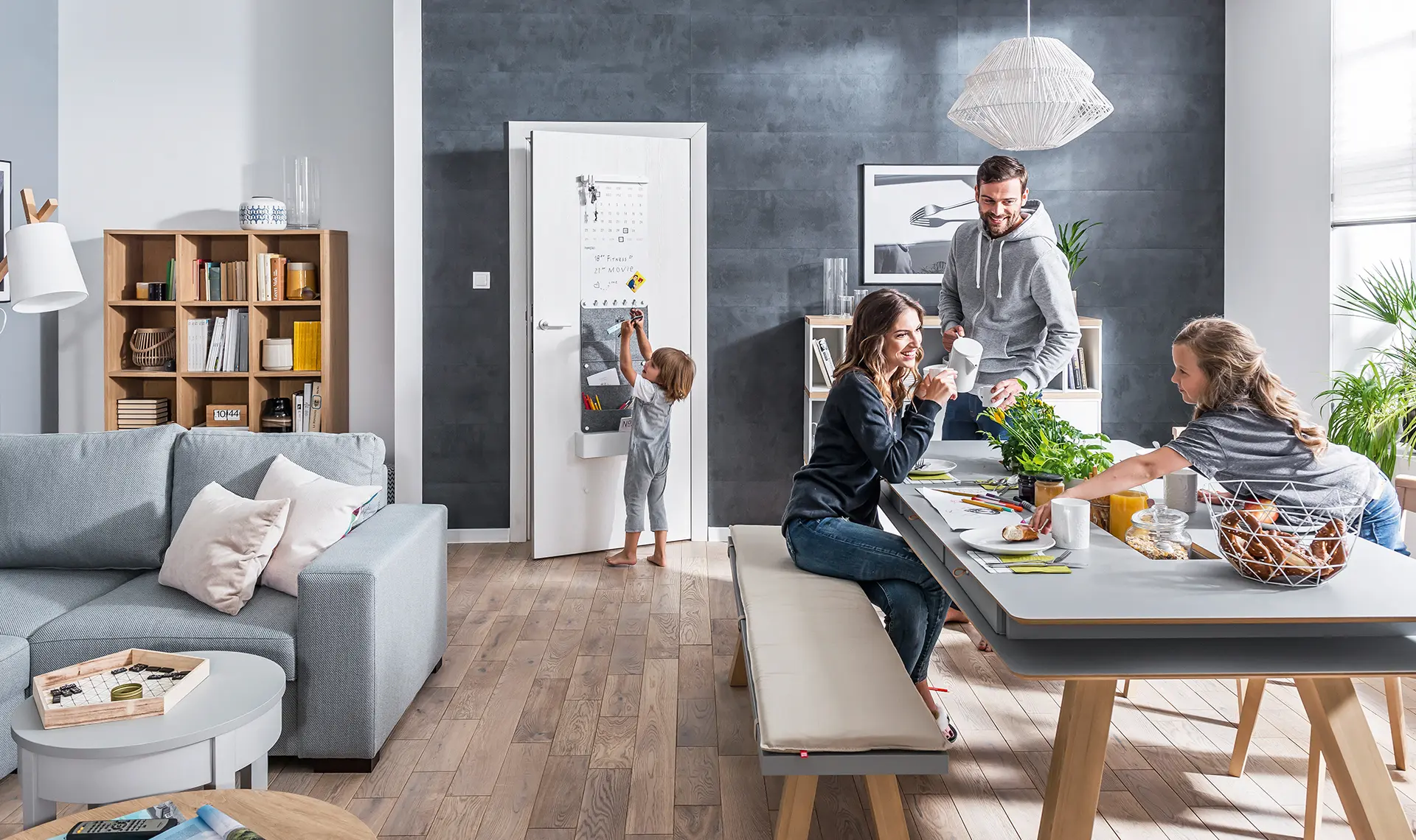 Szarość betonu doskonale uzupełnia się z wieloma odcieniami drewna, dlatego w takim pomieszczeniu sprawdzą się meble i ozdoby utrzymane w dekorze tego naturalnego surowca. Regał na ulubione książki czy klasyczny kredens z kolekcji Nature zapewni dużą ilość miejsc do przechowywania, a dodatkowo ociepli nieco szare wnętrze. Możemy też zabawić się kolorem mebli i ich detalami. Szafranowa komoda lub stół w odcieniu nude wybiją się na tle betonowej lub kamiennej ściany, która z wdzięcznością przyjmie ożywiającą mieszankę barw. Dzięki systemowi Creative możemy stworzyć takie meble, o jakich marzymy, samodzielnie dobierając do nich rodzaj nóżek i uchwytów. Surowej aranżacji elegancji dodadzą stalowe wykończenia, które będą świetnym uzupełnieniem dla mobilnej lampy Solar w szarym odcieniu.