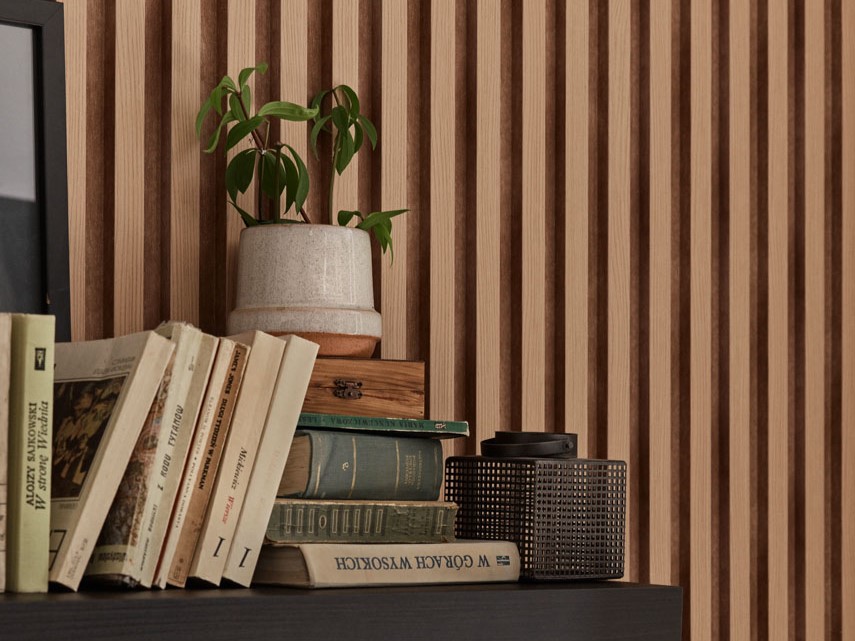 Drewno na ścianie może pojawić się zarówno w salonie pełnym żywiołowych barw, jak i epatującym luksusem. To, jaki nastrój zbudujemy, zależy przede wszystkim od jego koloru. Listwy w ciemniejszym odcieniu będą świetnie komponować się z czernią i głębokim brązem. Z kolei jaśniejsze lepiej wpasują się w przestrzeń, zdominowaną przez pastele lub kolory ziemi. Jeśli w naszym salonie nie brakuje nasyconych barw, złotym środkiem mogą okazać się panele w kolorze Mocca. Warto znaleźć na nie miejsce na przykład za telewizorem lub kanapą.