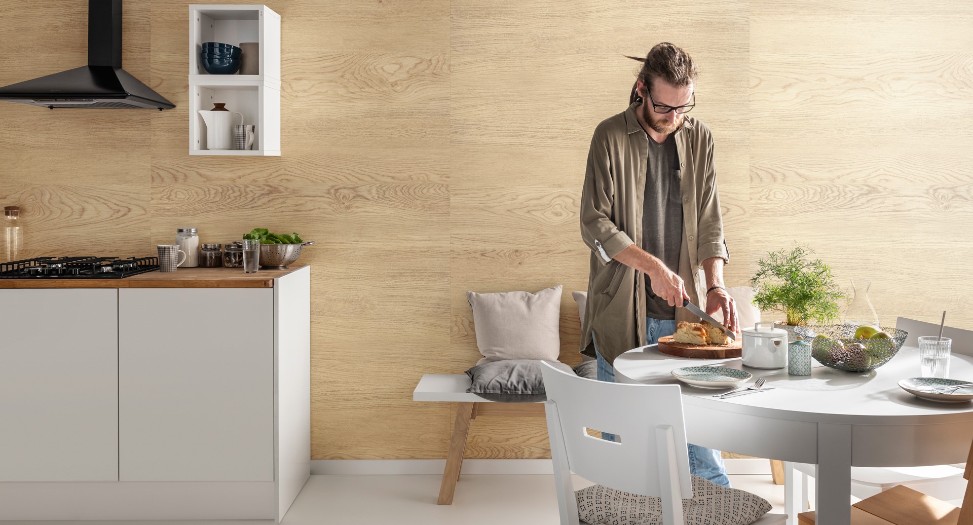 Zaletą nowoczesnych imitacji drewna jest ich wysoka odporność na zarysowania i uderzenia, a także wodoodporność i niepalność. Wszystkie wymienione cechy sprawiają, że takie rozwiązanie nadaje się również do szczególnie wymagających przestrzeni. Panele w zimniejszej tonacji sprawdzą się w nowoczesnej, minimalistycznie umeblowanej kuchni. Możemy zapełnić nimi na przykład przestrzeń nad blatem lub umieścić je za stołem. Ściana dekoracyjna Kerradeco w ciepłym, złotawym odcieniu będzie z kolei nastrojowym tłem do wspólnego gotowania.