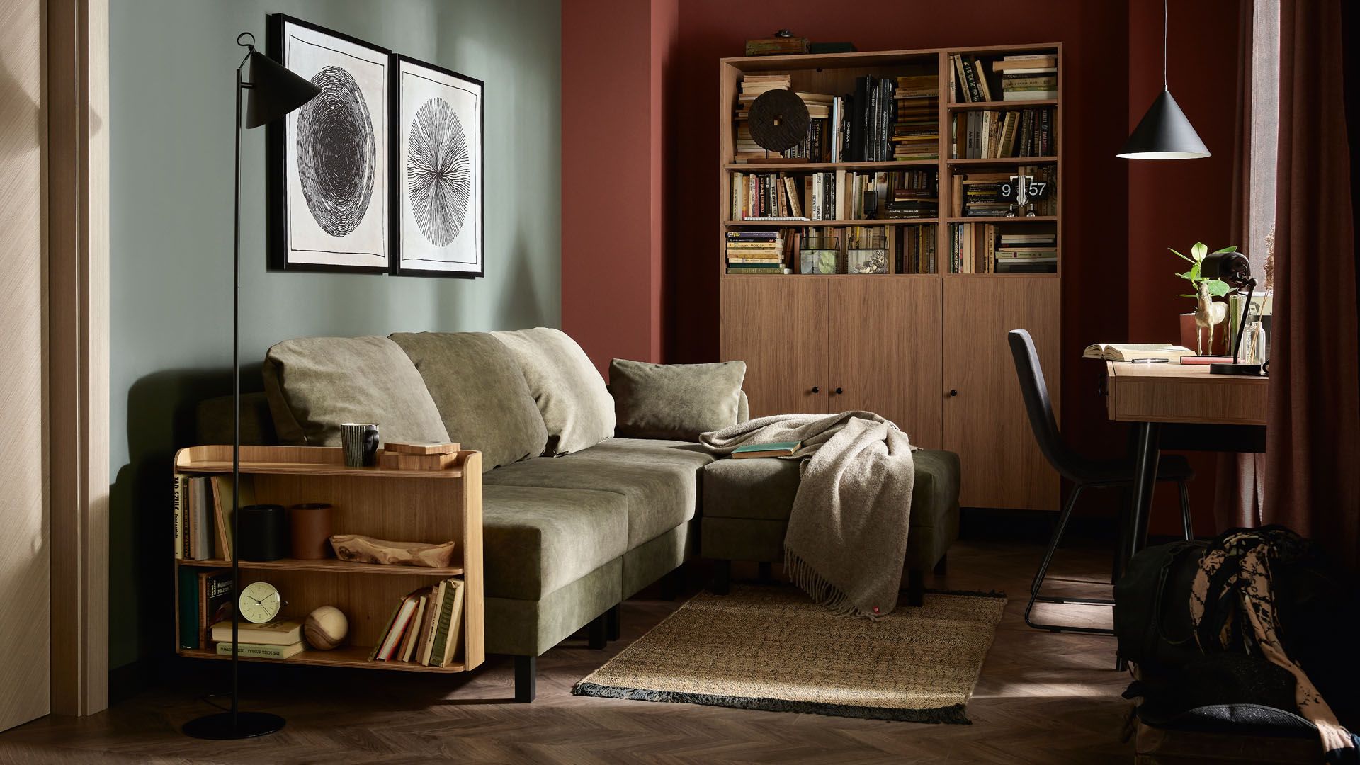 Jednolita ściana to za mało? Przetnijmy ją na pół! Dwa kolory możemy zestawić ze sobą na jednej płaszczyźnie w formie poziomych pasów. Dzięki temu pomieszczenie wyda się szersze i nabierze głębi. Ściany w kolorze brudnego różu stworzą harmonijną parę z szerokim pasem eleganckiej czerni. W tak pomalowanym salonie swoje miejsce znajdzie beżowa kanapa Pelo, uzupełniona drewnianymi meblami z ciemnymi elementami. Nowoczesnego kunsztu nadzą oryginalne lampy Ball o kulistym abażurze i matowym wykończeniu.