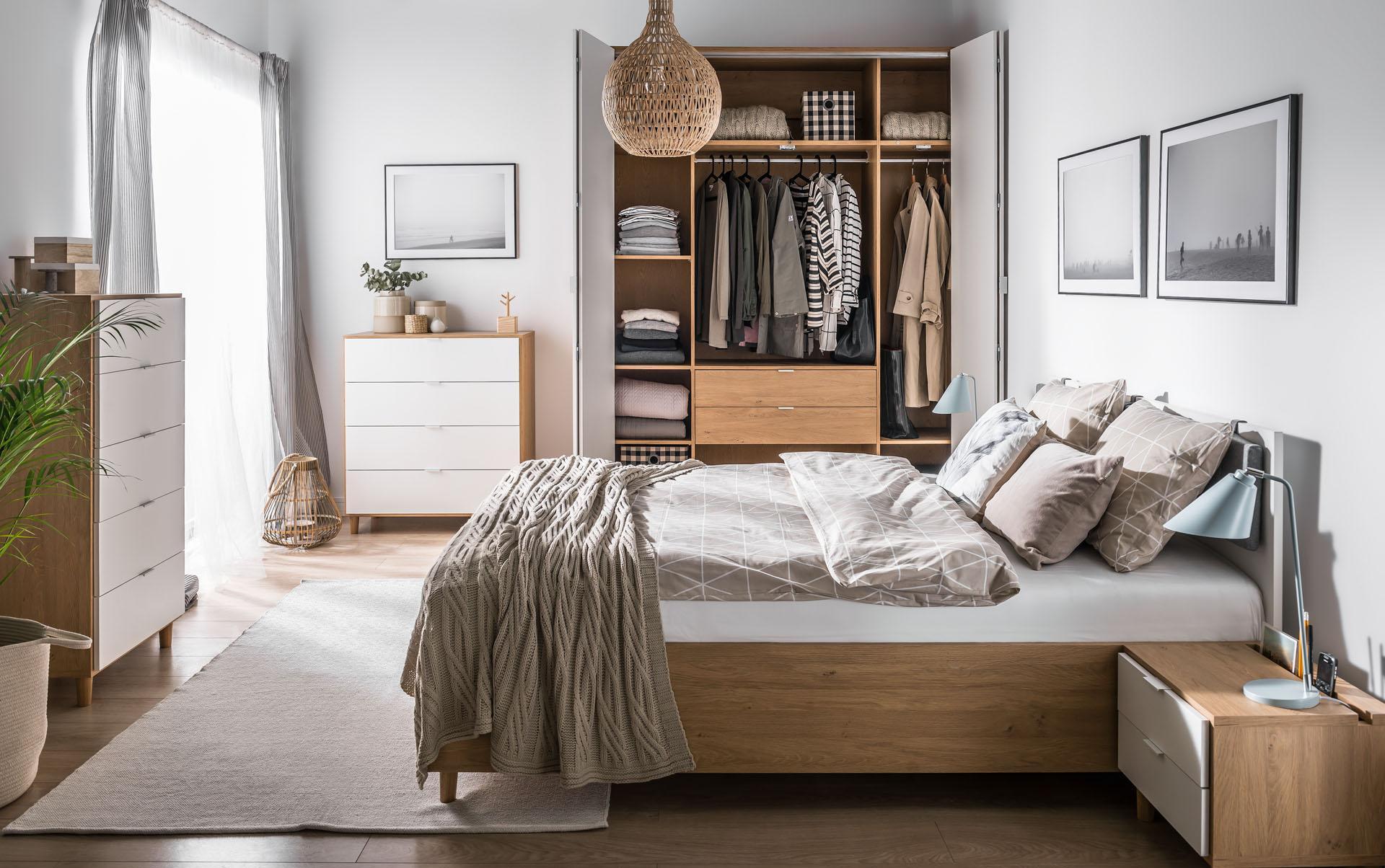 Do mniejszej szafy warto dokupić specjalną nadstawkę, która zapewni brakujące miejsce na pościel. Alternatywą może stać się niewielka komoda z głębokimi szufladami, w której pościel przechowamy razem z ręcznikami i bielizną.
