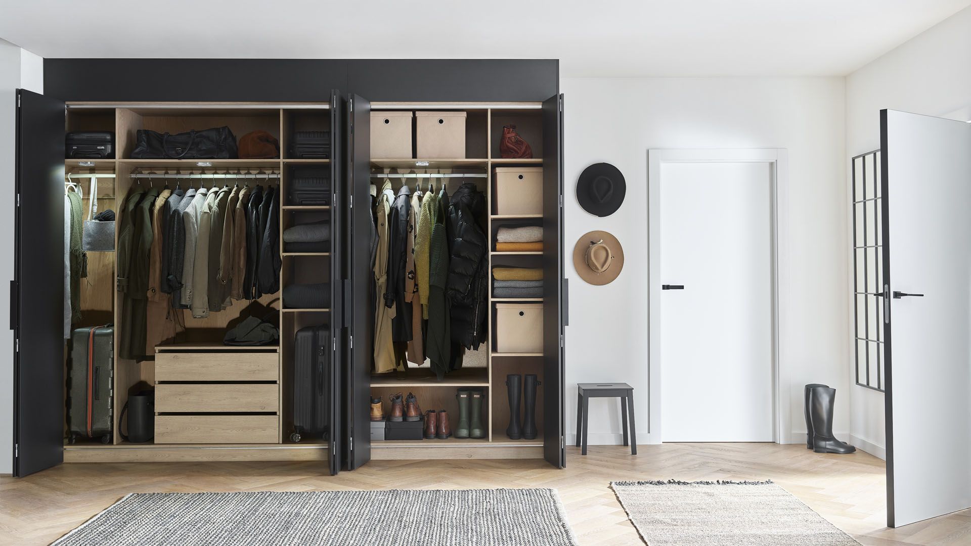 Szafa z kolekcji Stor, którą można elastycznie personalizować, świetnie sprawdzi się na przykład wtedy, gdy szukamy miejsca do przechowywania butów. Pudełka z rzadziej używanymi parami wygodnie ułożymy na górnych półkach, a buty na specjalną okazję – w szerokiej wnęce pod szufladami. Gdy domowa kolekcja obuwia szybko rośnie, łatwo możemy zmienić układ wnętrza szafy i dopasować go do naszych potrzeb, przekładając półki i wieszaki na ubrania.