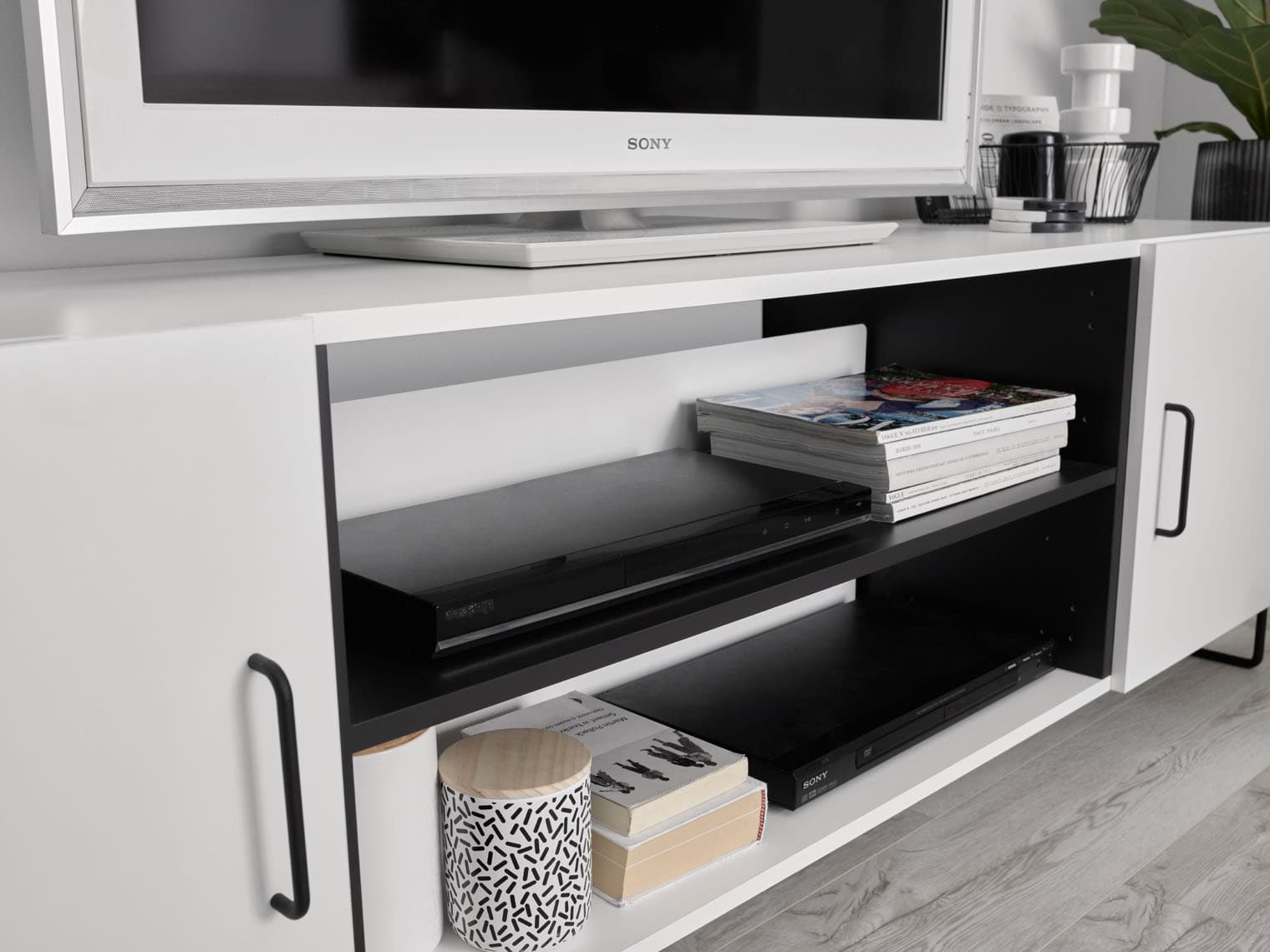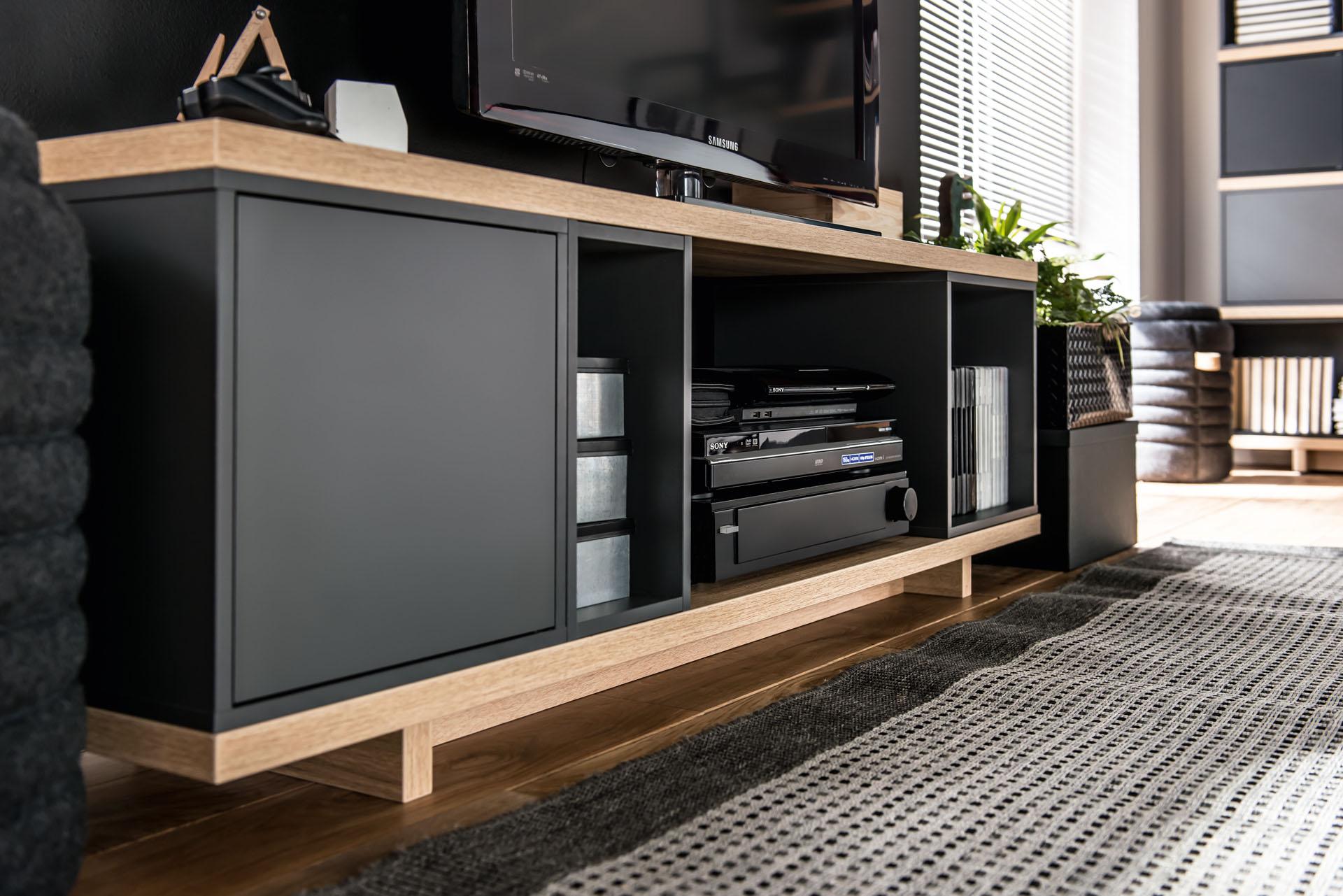 W pokoju dziennym organizacji wymagają również urządzenia audio. Możemy je wyeksponować, wykorzystując otwarte półki w szafce RTV z kolekcji Creative czy Ribbon. Brak tylnej ścianki pozwoli wygodnie wyprowadzić okablowanie za mebel i umożliwi swobodną cyrkulację powietrza między sprzetami. Szczególnie problematyczne może okazać się ukrycie przewodów od telewizora, który został zawieszony na ścianie. Najbardziej estetyczny efekt uzyskamy, montując tunel w ścianie, ale czasami chcemy obejść się bez kucia. Z pomocą przyjdą nam wówczas listwy maskujące, które możemy dociąć do potrzebnego rozmiaru i pomalować na kolor ściany.