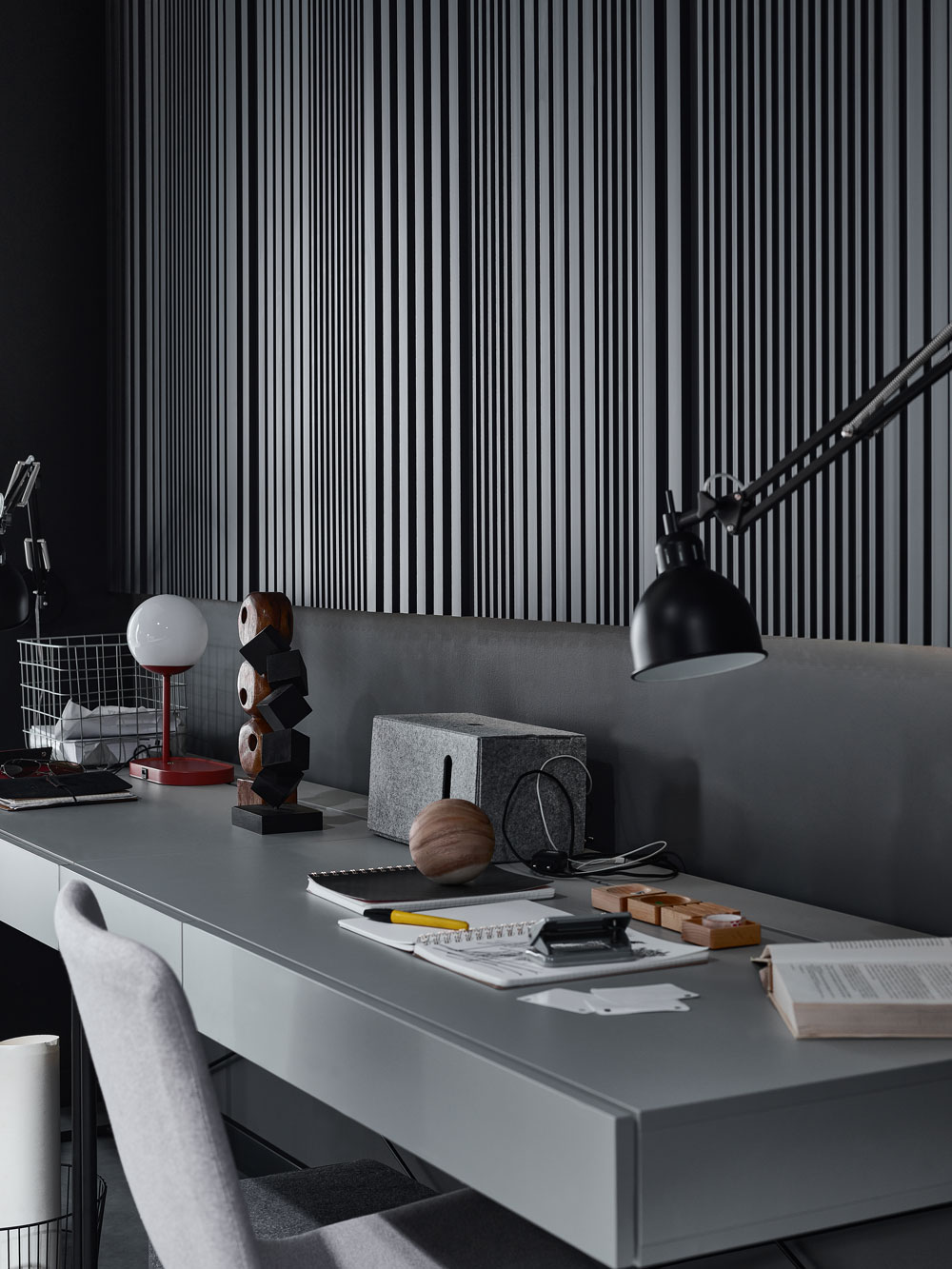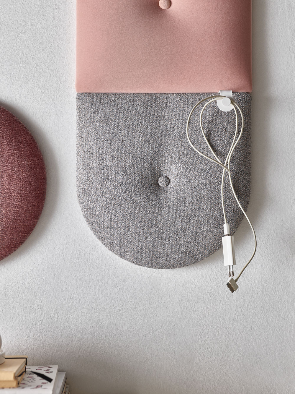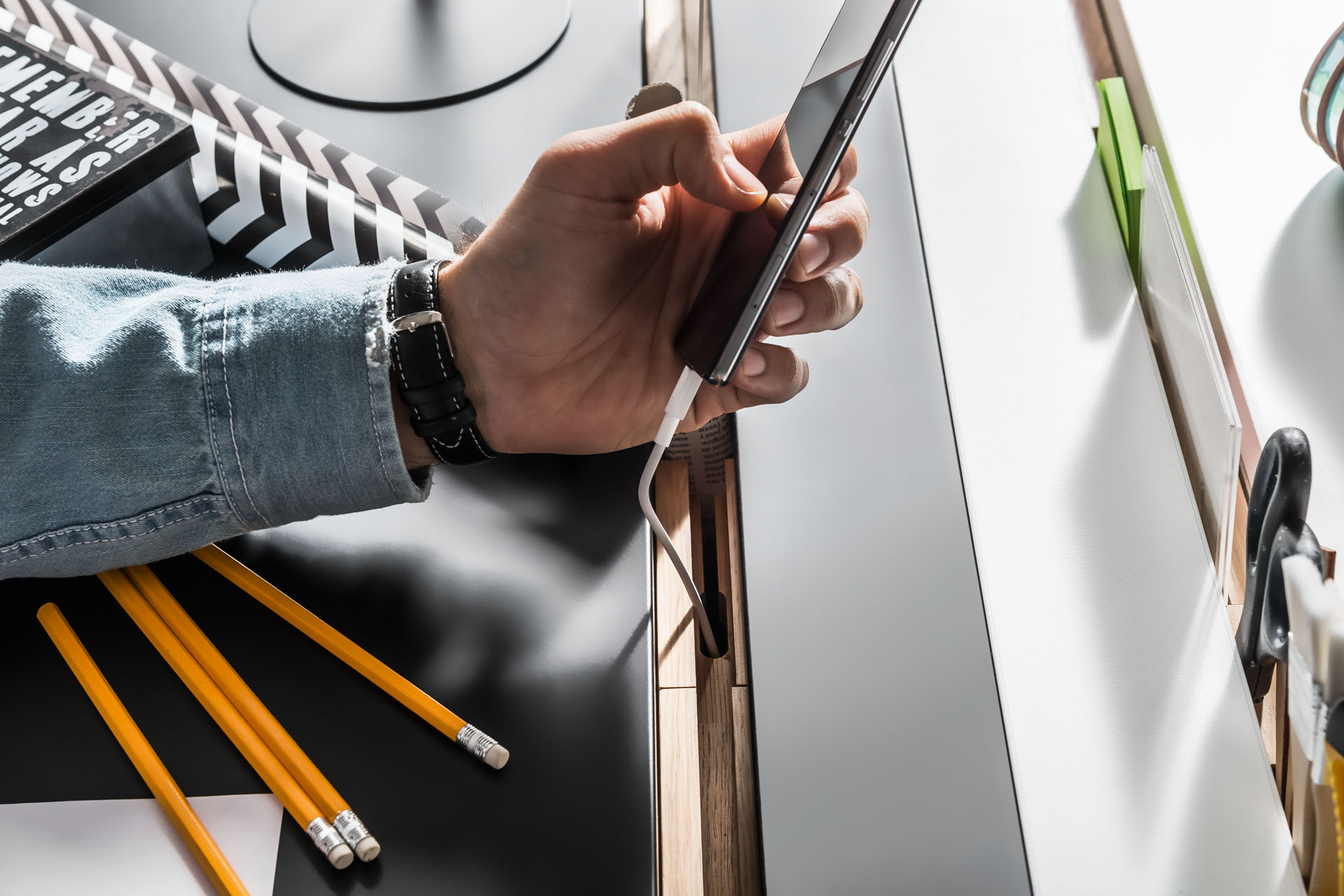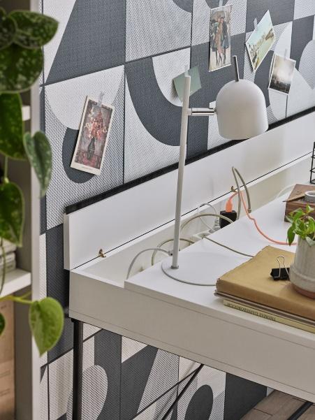 Ciekawym sposobem na wyeksponowanie niewielkich przewodów będą także panele ścienne. Do tapicerowanych paneli Soform możemy dokupić potrzebną liczbę haczyków i gumek, które pomogą uporządkować drobne akcesoria. Na ścianie nad biurkiem sprawdzą się też tablice Slot. Znajdziemy w nich otwory, które pozwalają na montaż dedykowanych kołków, półek i kieszeni. Dzięki nim uporamy się z bałaganem wśród splątanych kabli i nie tylko.