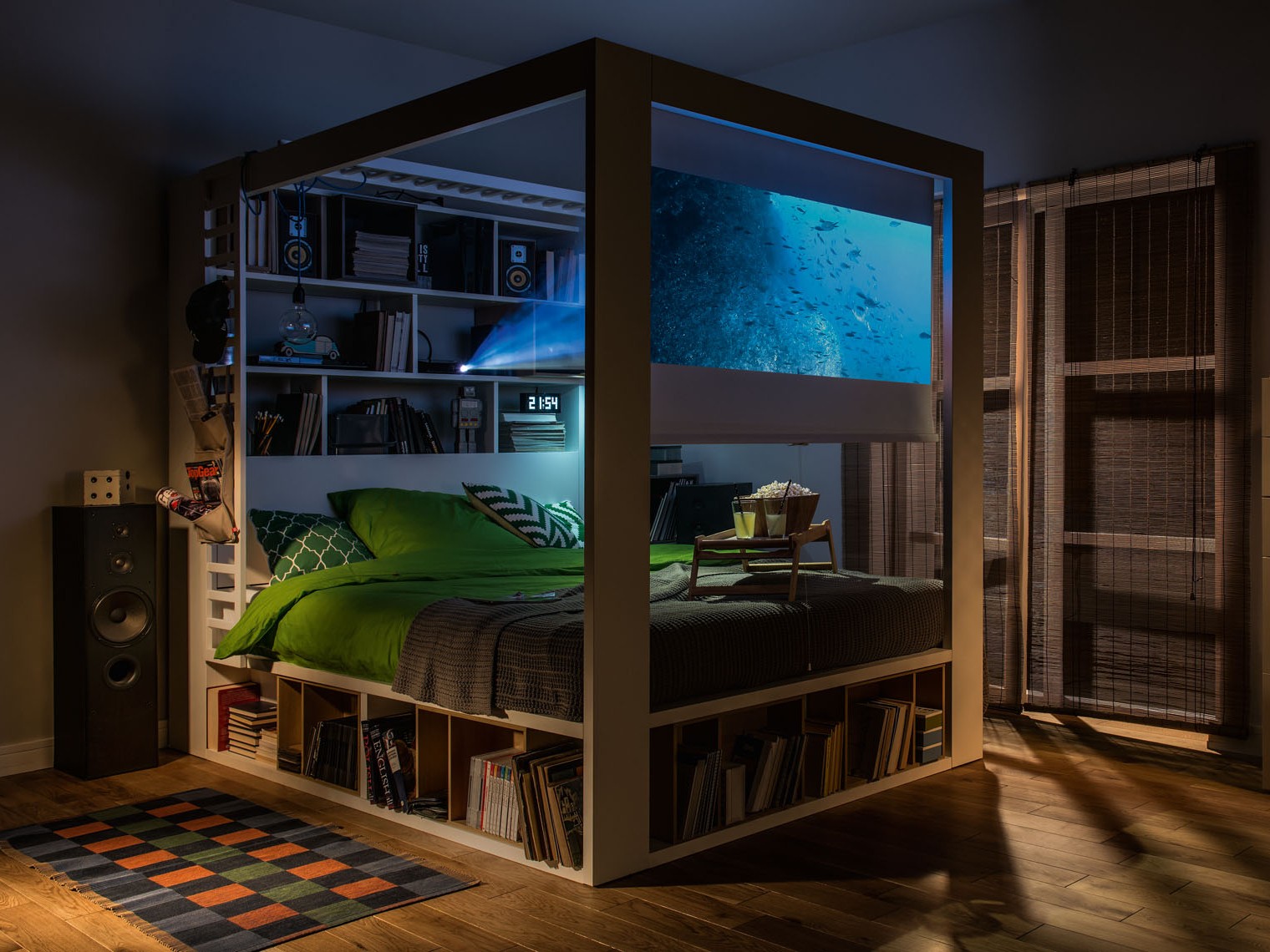 Wielofunkcyjne łóżko wypełni niewielką przestrzeń sypialni dobrymi pomysłami i sprawi, że będzie potrafiła naprawdę sporo. To w końcu nie tylko wygodne miejsce do spania, ale również uniwersalny regał. Pełno w nim sprytnych, łatwo dostępnych wnęk i schowków, ukrytych w dolnej ramie łóżka oraz za jego szczytem. Dzięki sprytnej konstrukcji bez trudu pomieści ubrania, osobiste pamiątki, książki, ozdoby czy doniczki z roślinami. Na łóżku możemy też zawiesić baldachim, sprawiając, że wnętrze stanie się odpowiednio intymne i przytulne. To nadal za mało? Łóżko możemy też zamienić w swoje własne kino domowe – wystarczy, że na półce postawimy projektor, a po drugiej stronie rozwiniemy ukryty w baldachimie ekran.